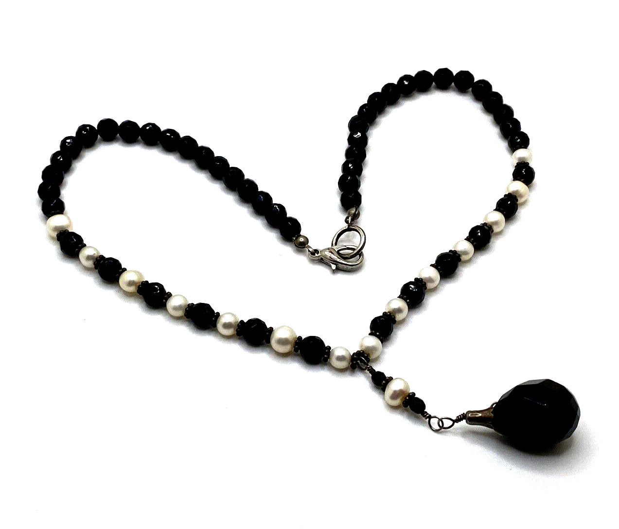 Vintage Genuine Pearl Faceted Black Bead Collar Necklace with Teardrop Pendant