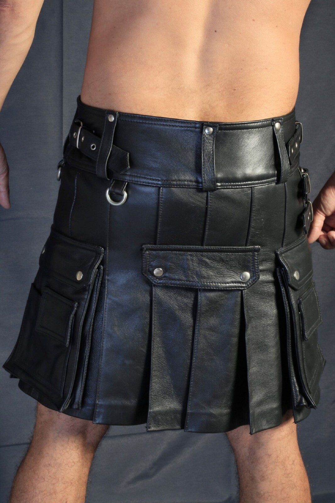 как выглядит Mens Real Leather Cargo Pockets Pleated Kilt Leather Clubwear Utility Kilt фото