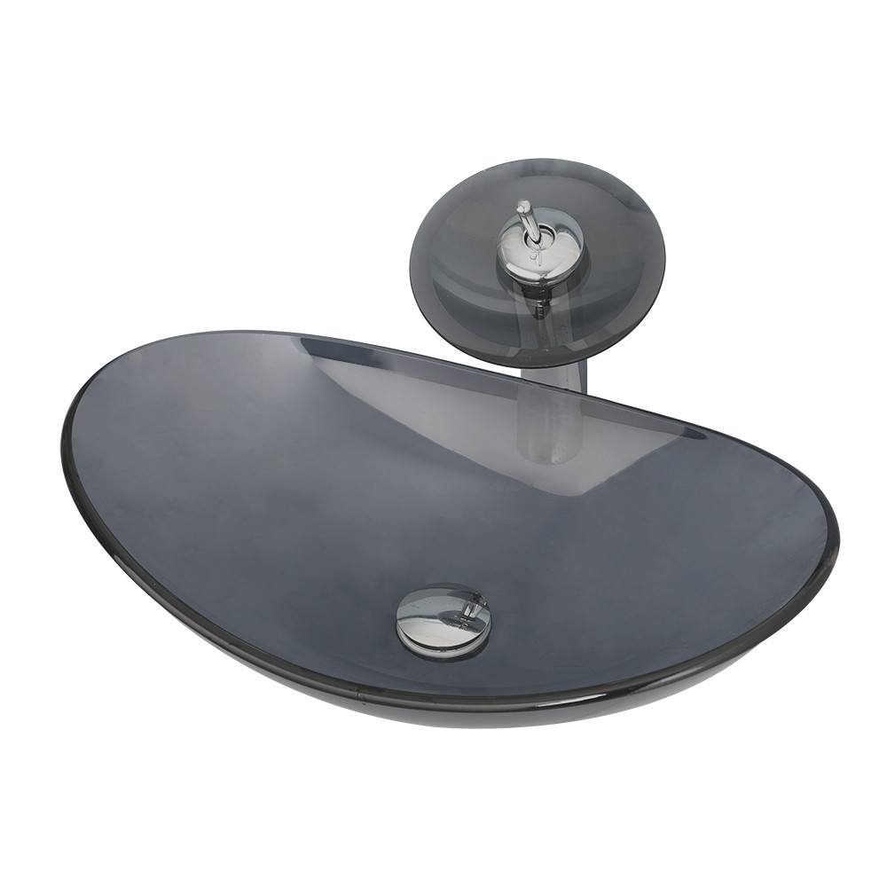 Oval Tempered Glass Vessel Sink Faucet For Bathroom Pop-Up Drain Combo Tap Set