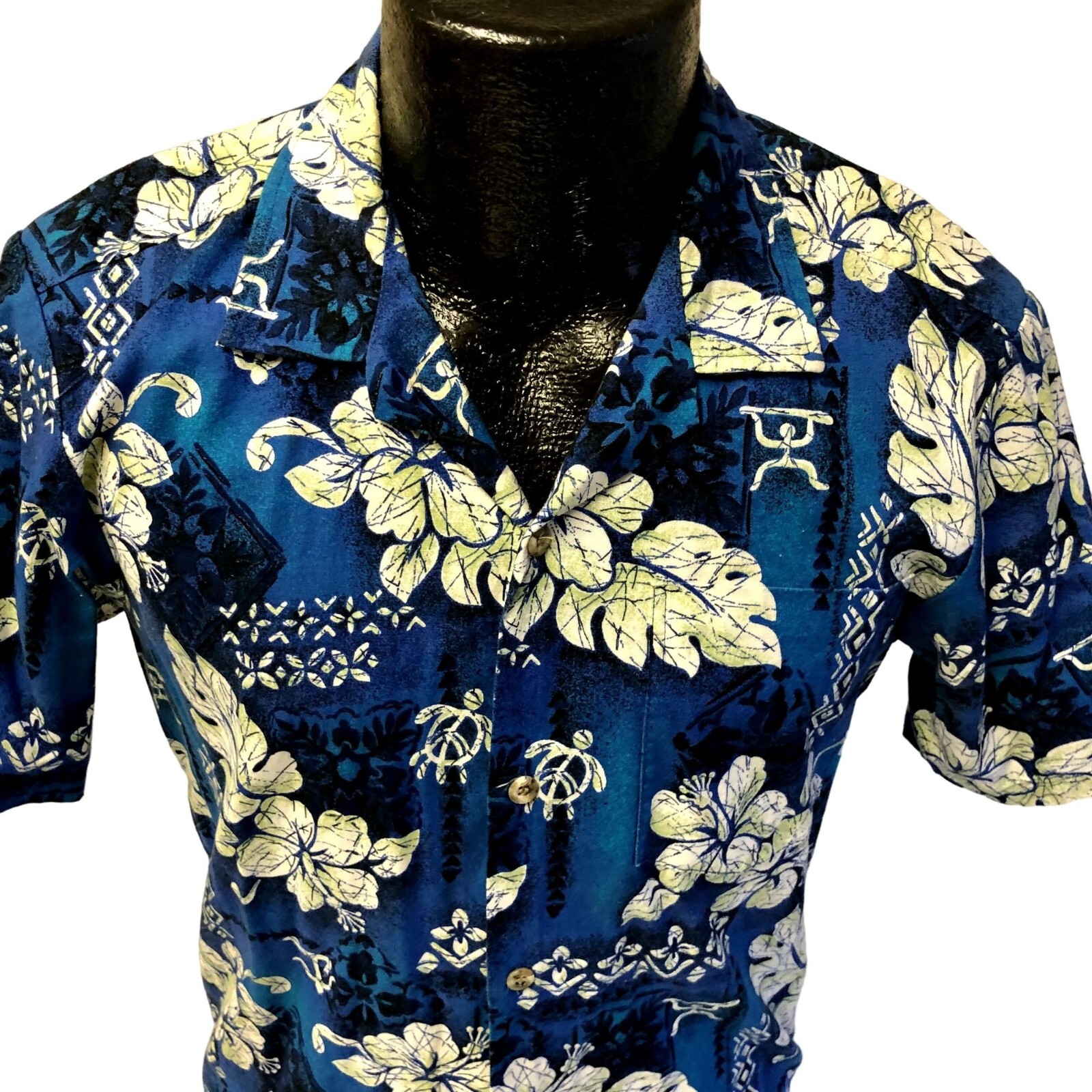 Vtg 80's Hawaii Blue FLORAL Savages Islands TURTLES Hawaiian ALOHA Shirt S