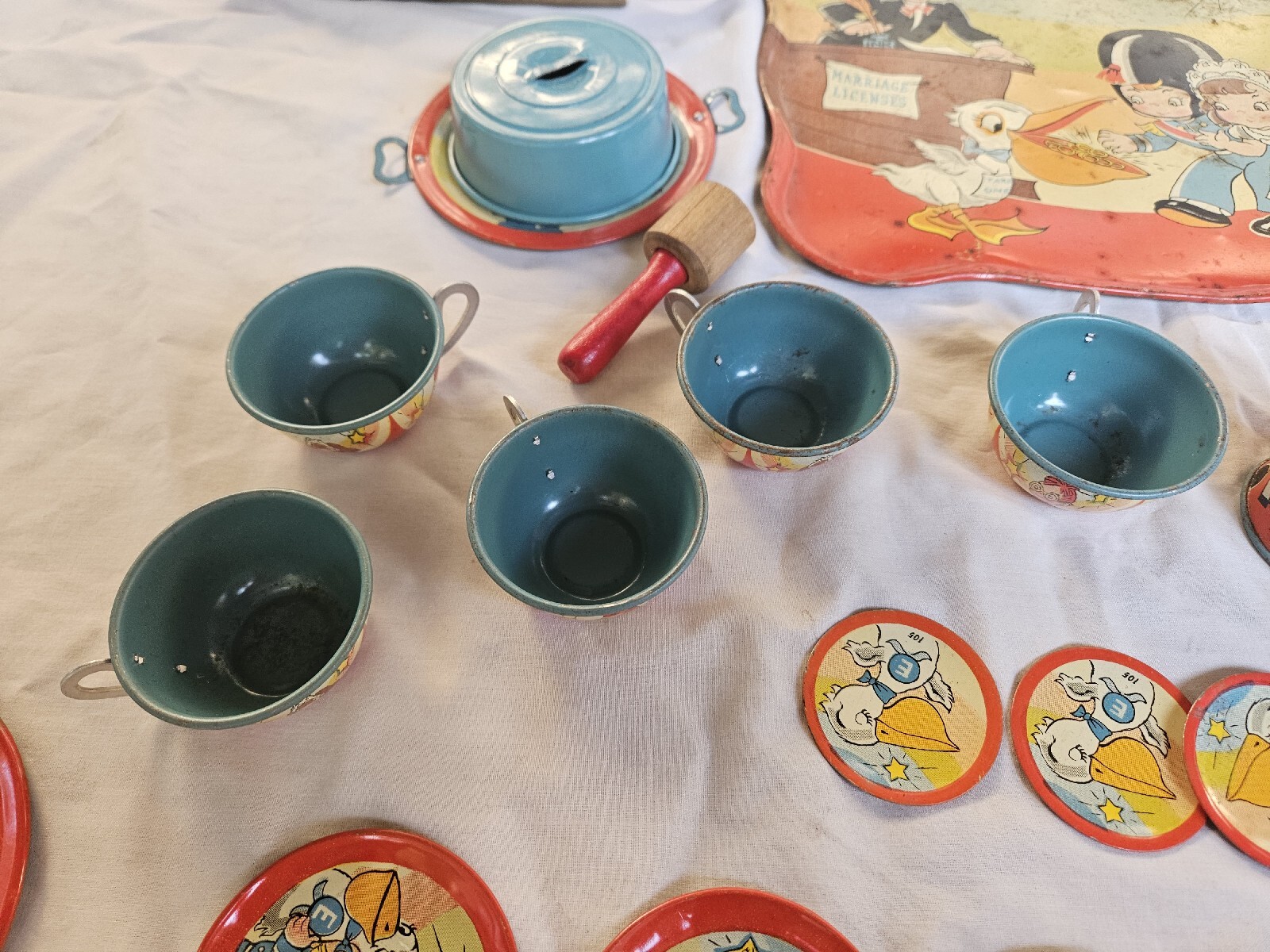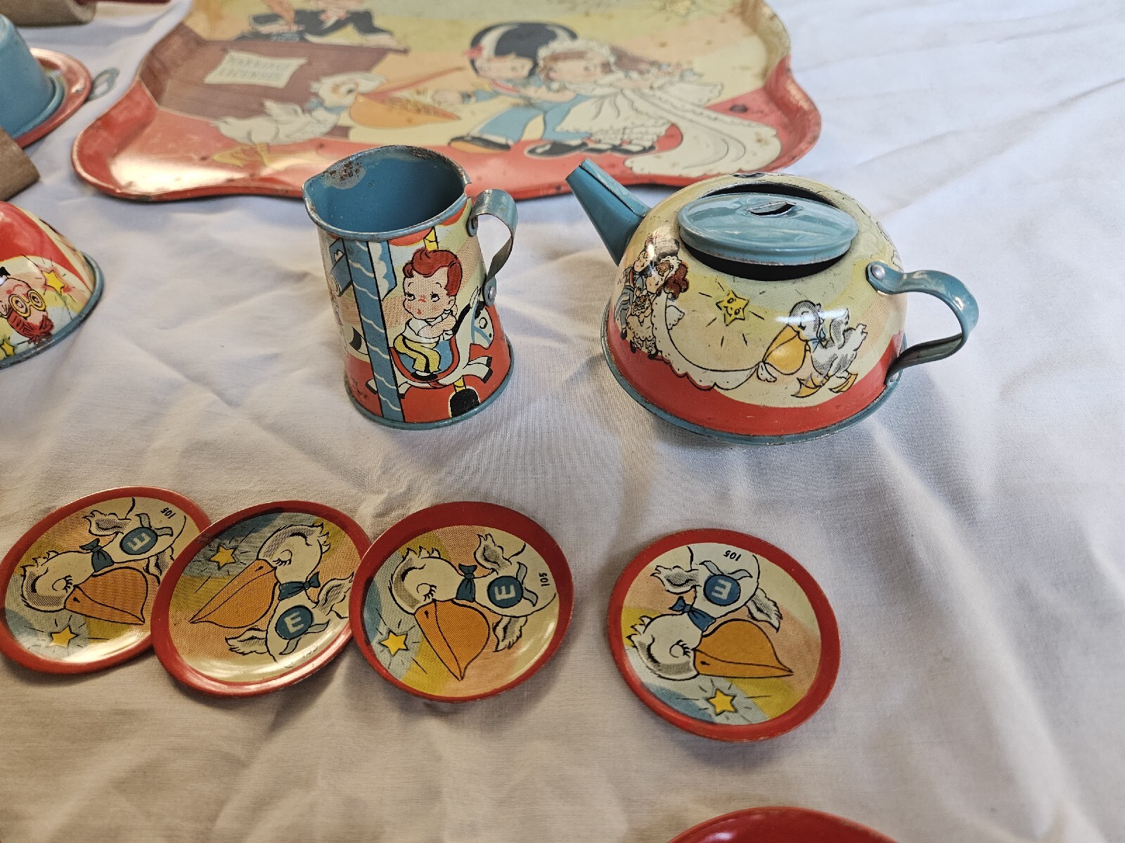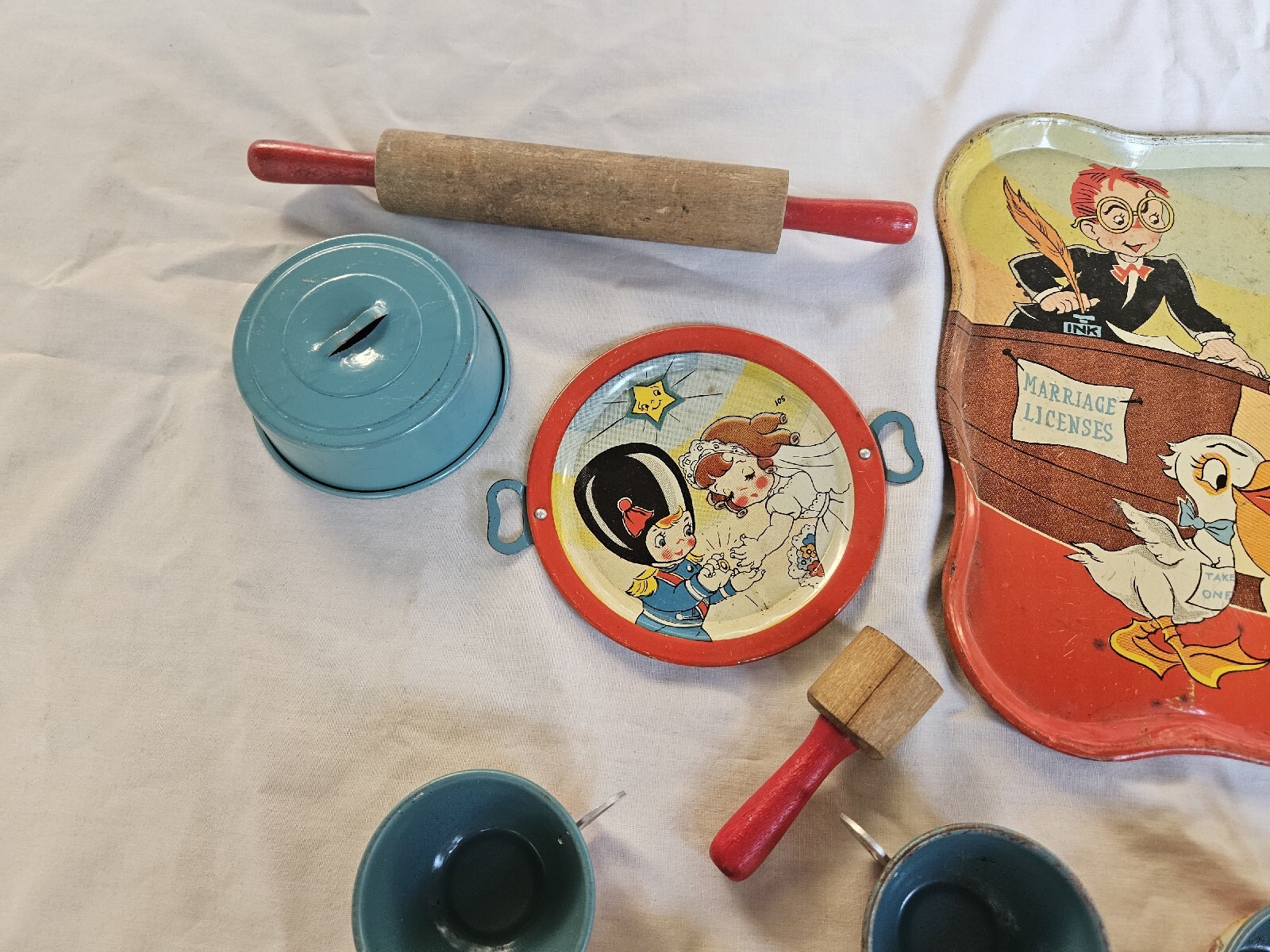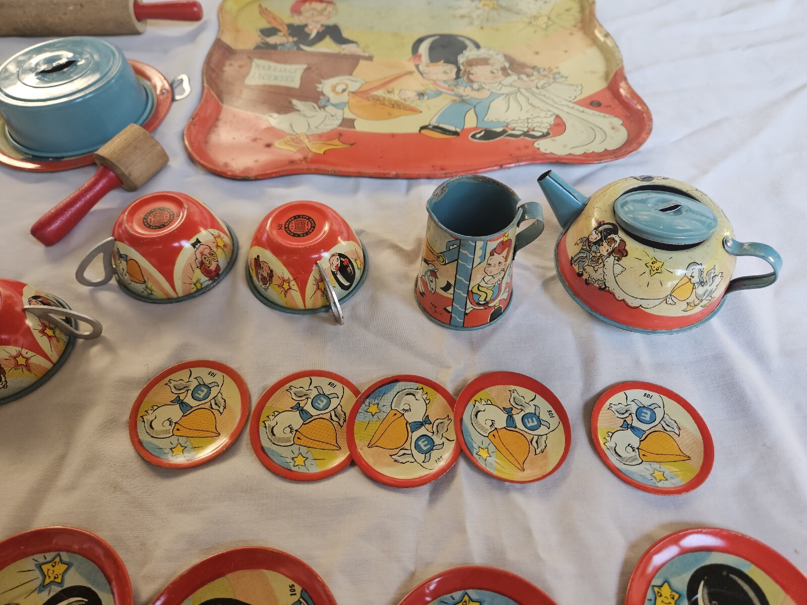 Vintage OHIO ART Tin Litho 28 Piece Tea Set Girl Bride Boy Groom Marriage Rare