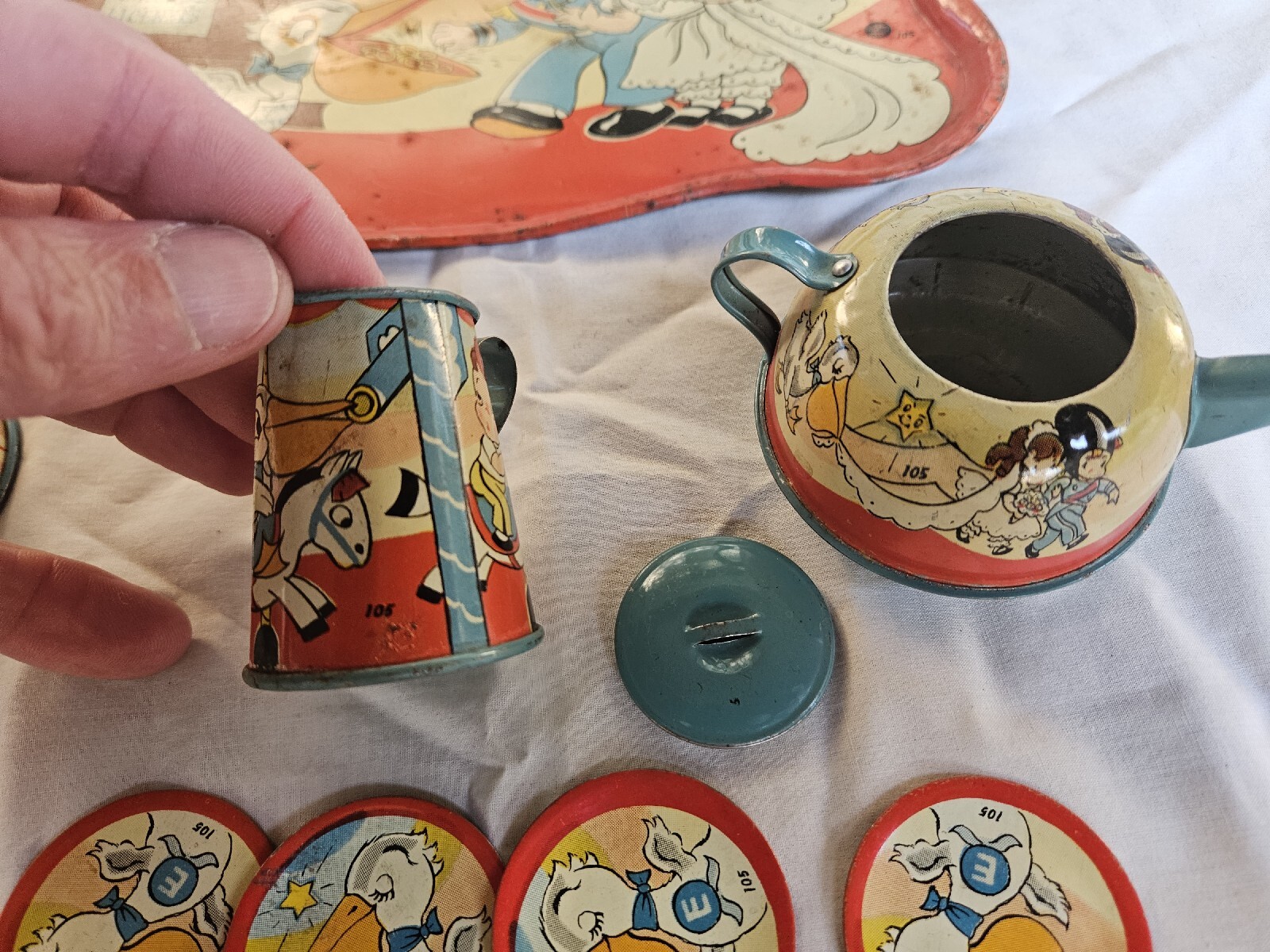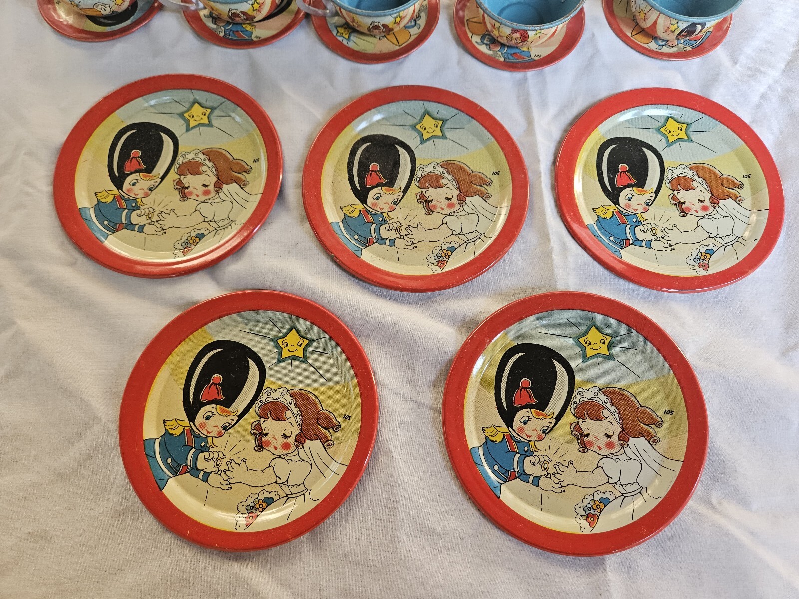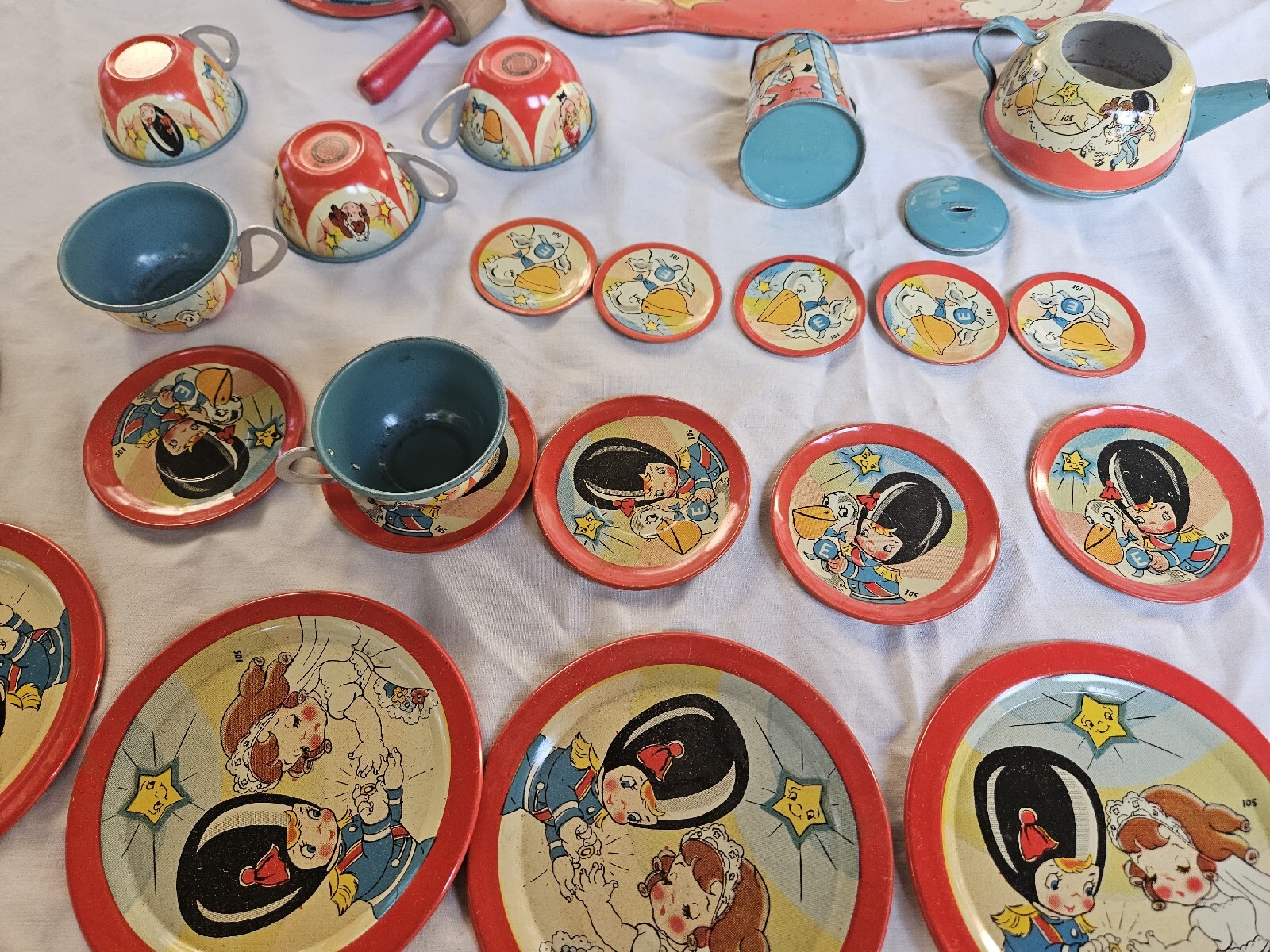 Vintage OHIO ART Tin Litho 28 Piece Tea Set Girl Bride Boy Groom Marriage Rare