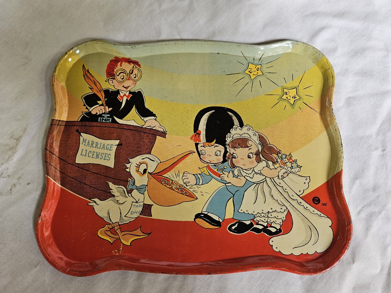 как выглядит Vintage OHIO ART Tin Litho 28 Piece Tea Set Girl Bride Boy Groom Marriage Rare фото