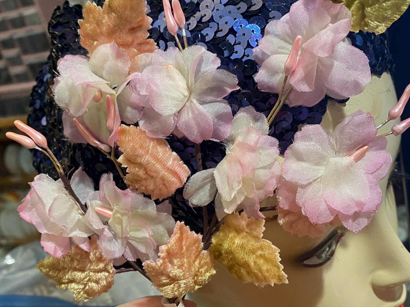 как выглядит vintage silk 1940 pink cherry blossoms pearl stamens velvet leaves 1 spray Japan фото