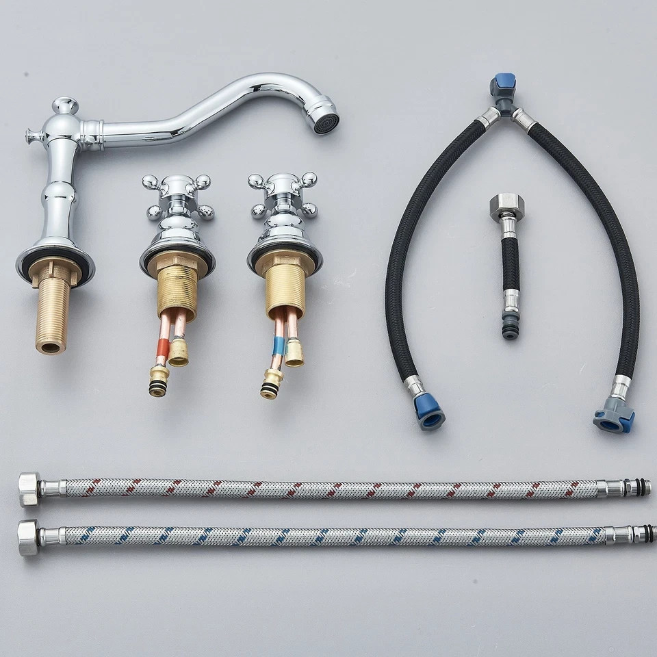 Bathroom Sink Faucet Polished Chrome 2 Handles 3 Holes Vanity Mixer Tap W/ Drain