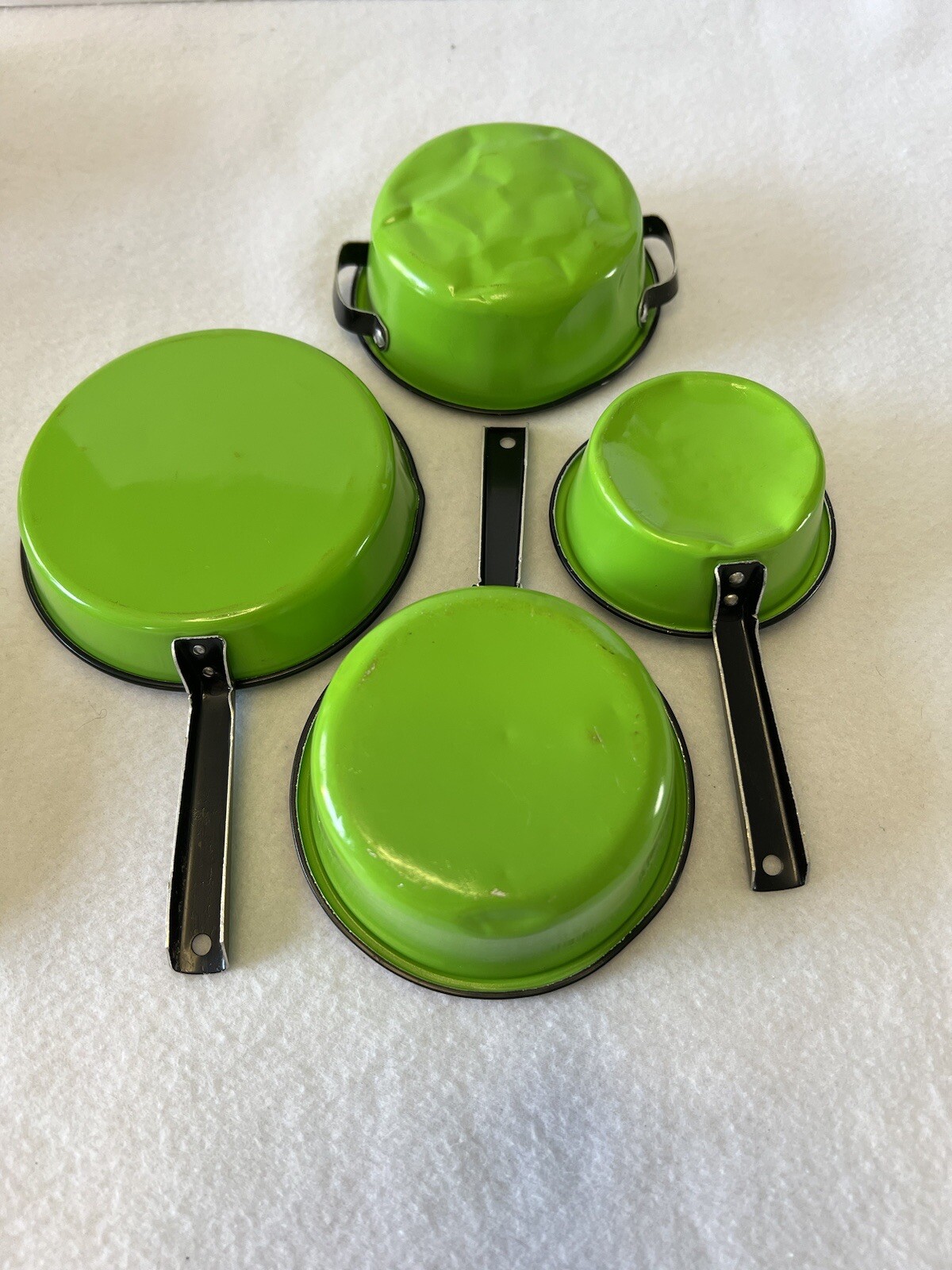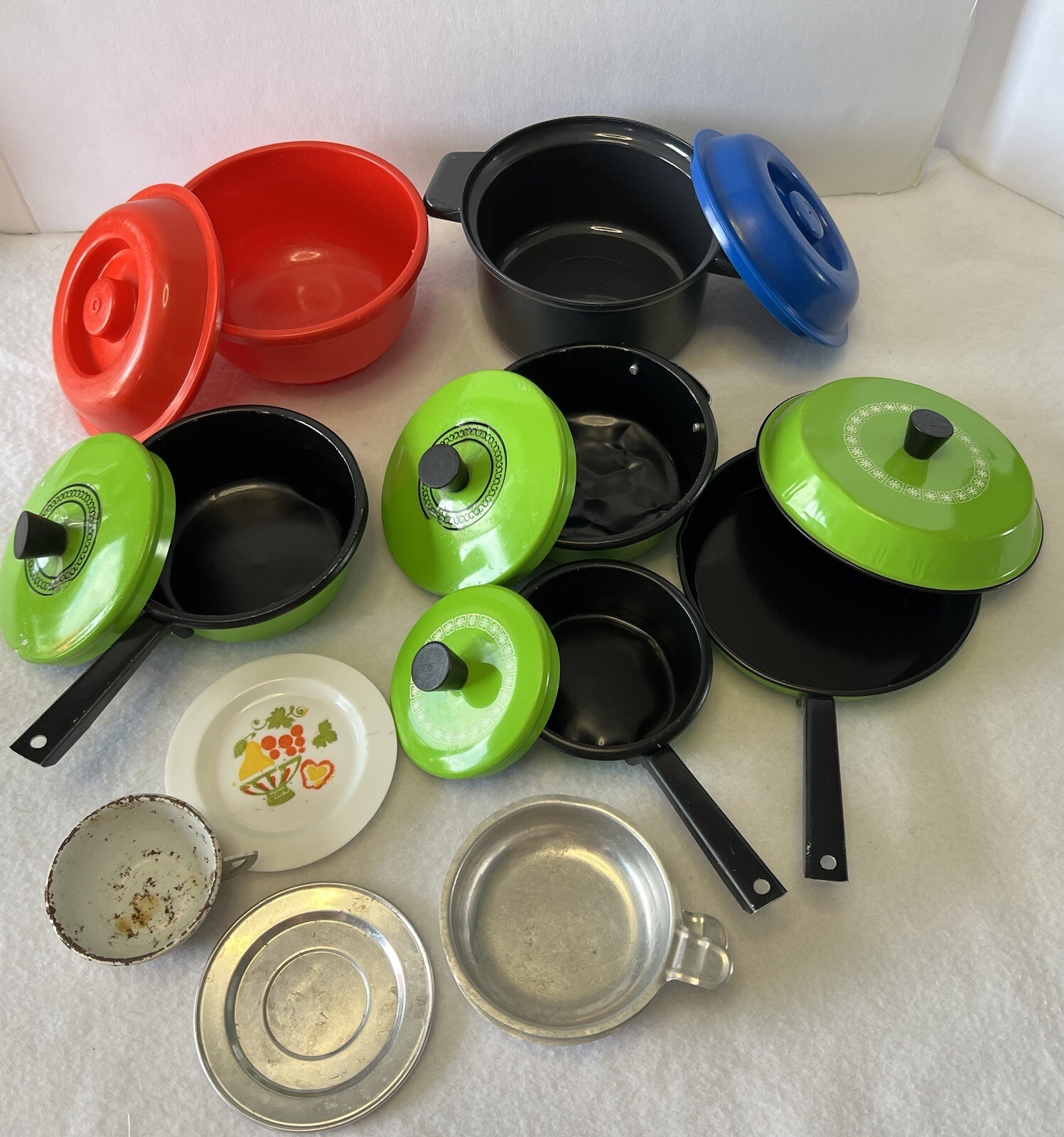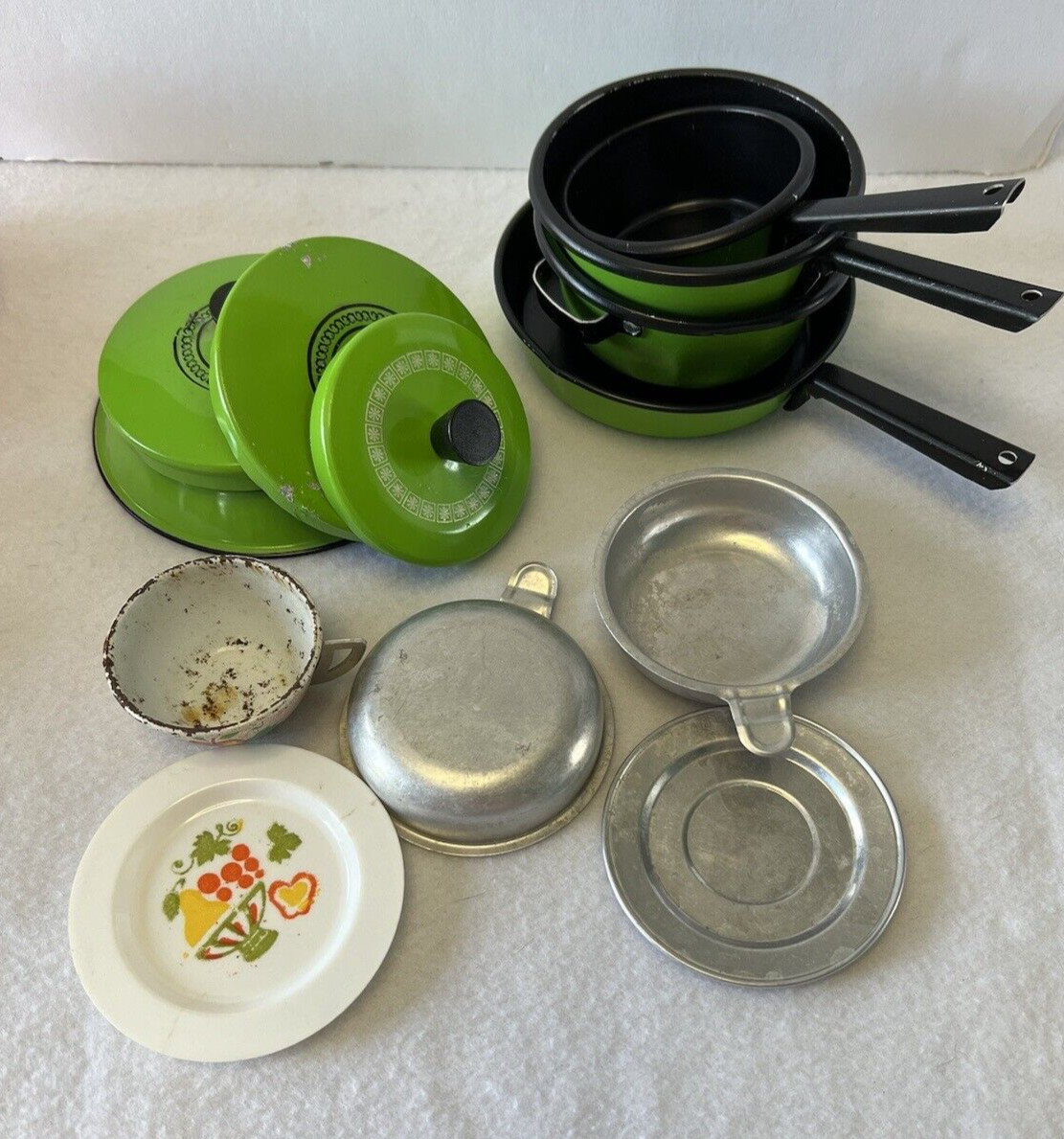 Vintage Unbranded Child Green Cookware Dishes and Plastic lidded Bowls 17 Pieces