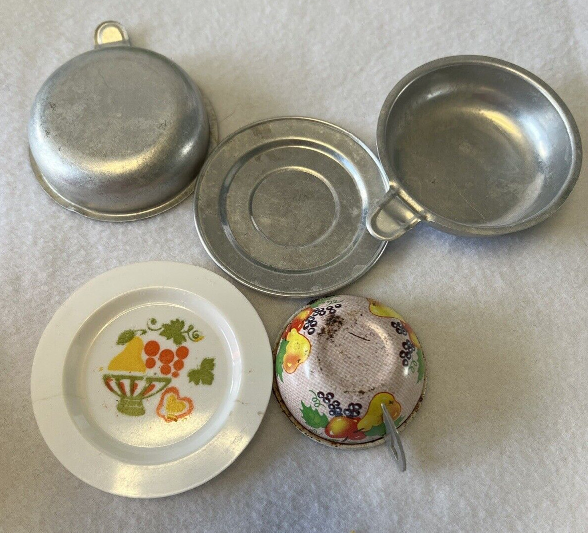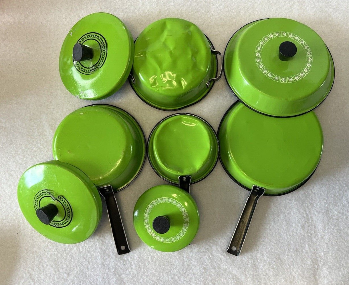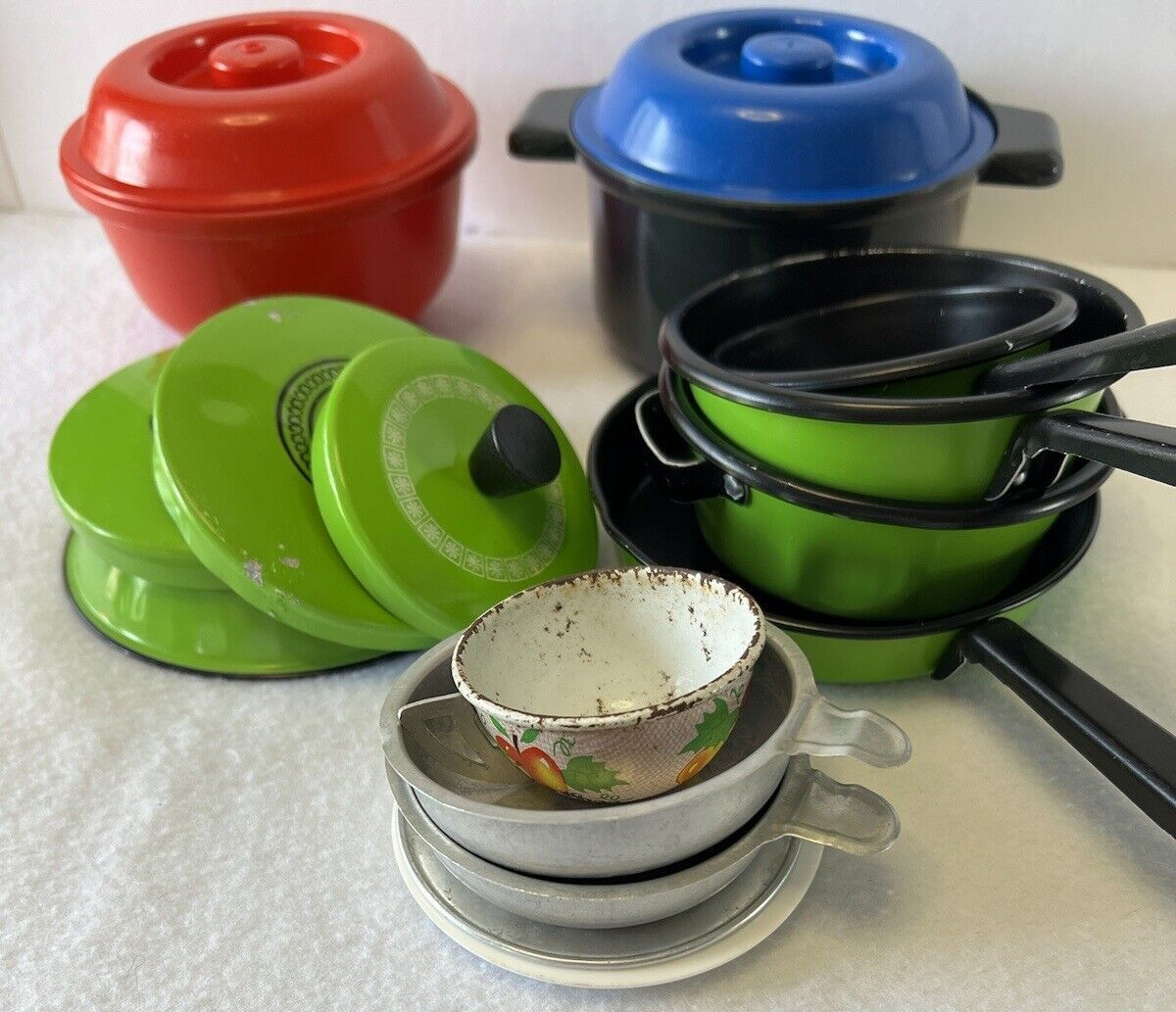 Vintage Unbranded Child Green Cookware Dishes and Plastic lidded Bowls 17 Pieces