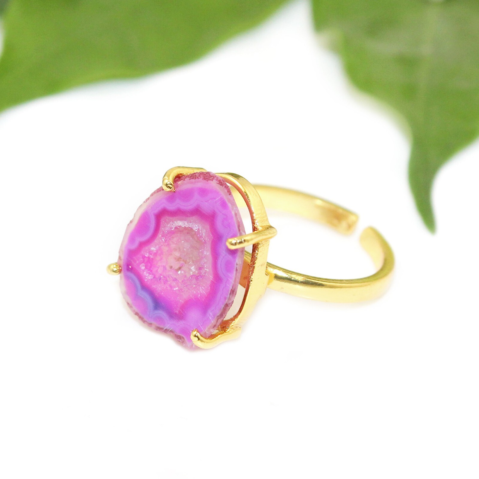 Natural Petrol Pink Geode Druzy Prong Settings 24K Gold Plated Adjustable Rings