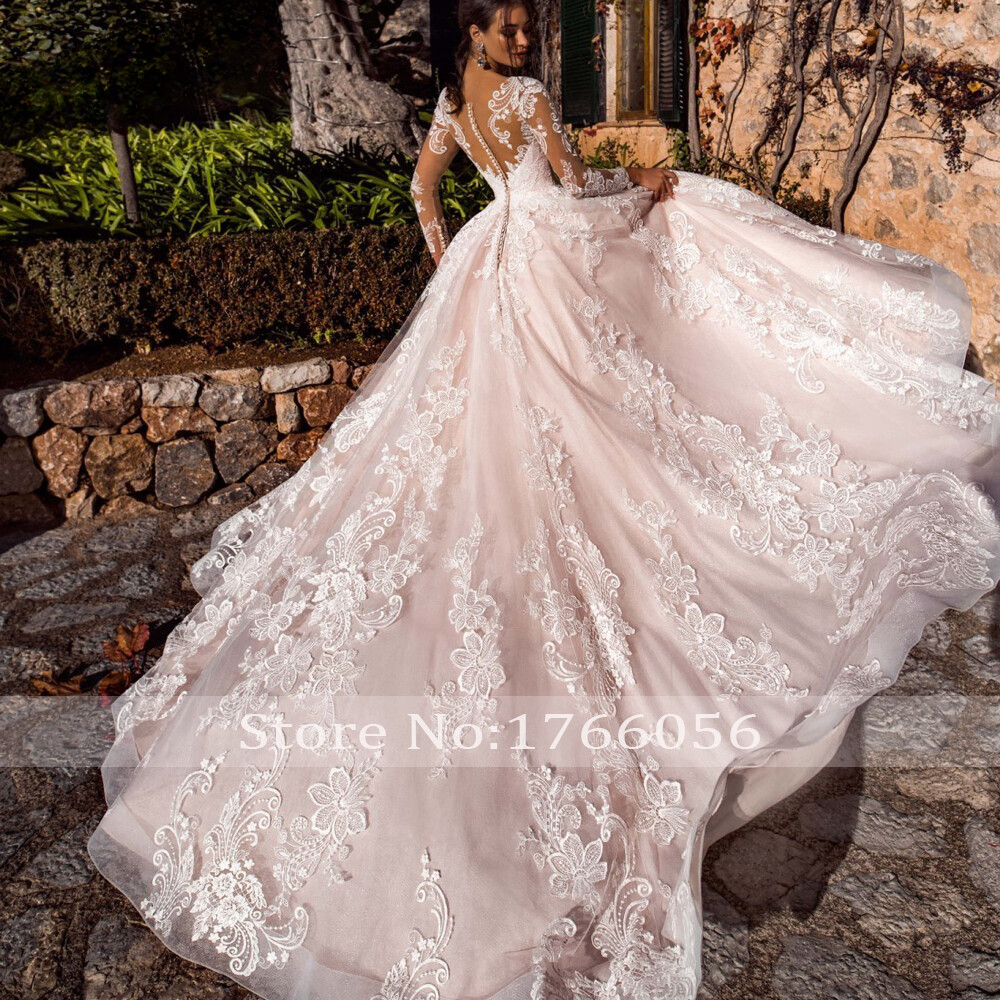 как выглядит A Line Wedding Dresses Illusion Long Sleeve Scoop Neck Lace Applique Bridal Gown фото