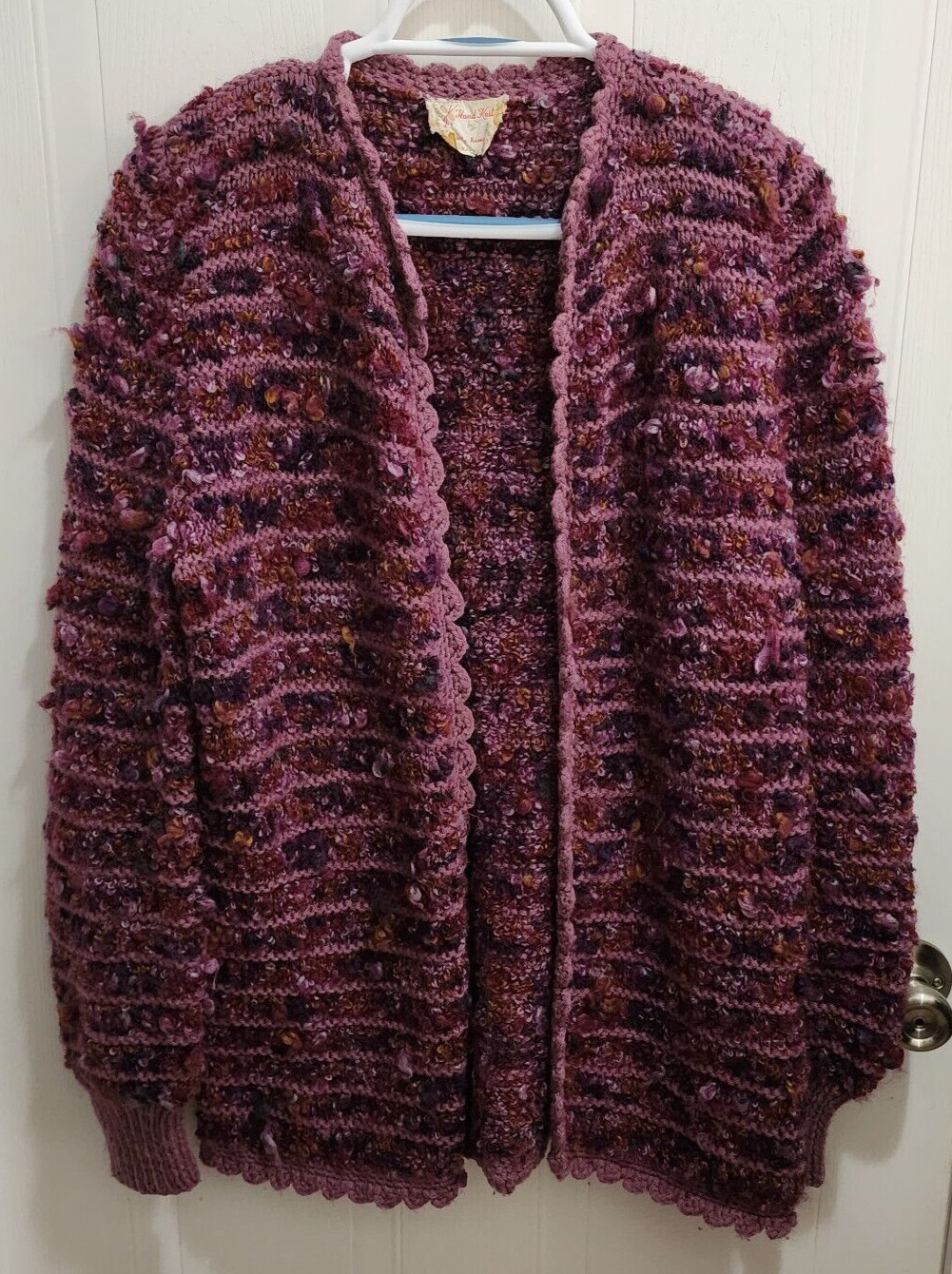 Vtg Hand Knit L/S Open Front Cardigan Sweater Chunky Bubble Knit Purple Sz 2-3X