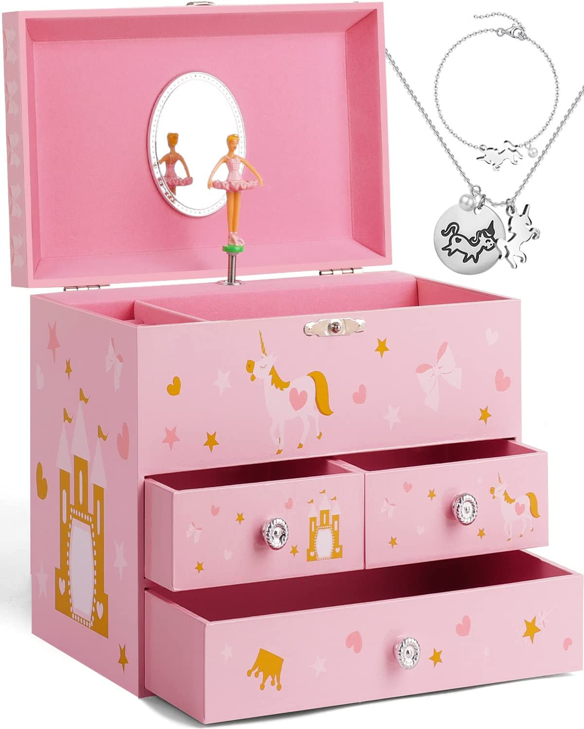 Upgrade Musical Jewelry Box for Girls with 3 Pullout Drawers Spinning Ballerina