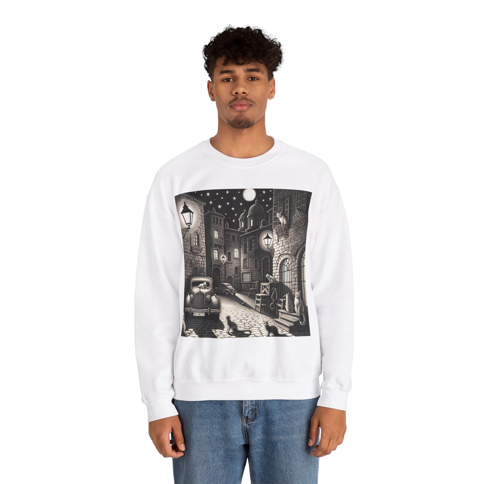 как выглядит Unisex Adult Crewneck Sweatshirt Vintage Alley Cats Night Town Moonlight Street фото