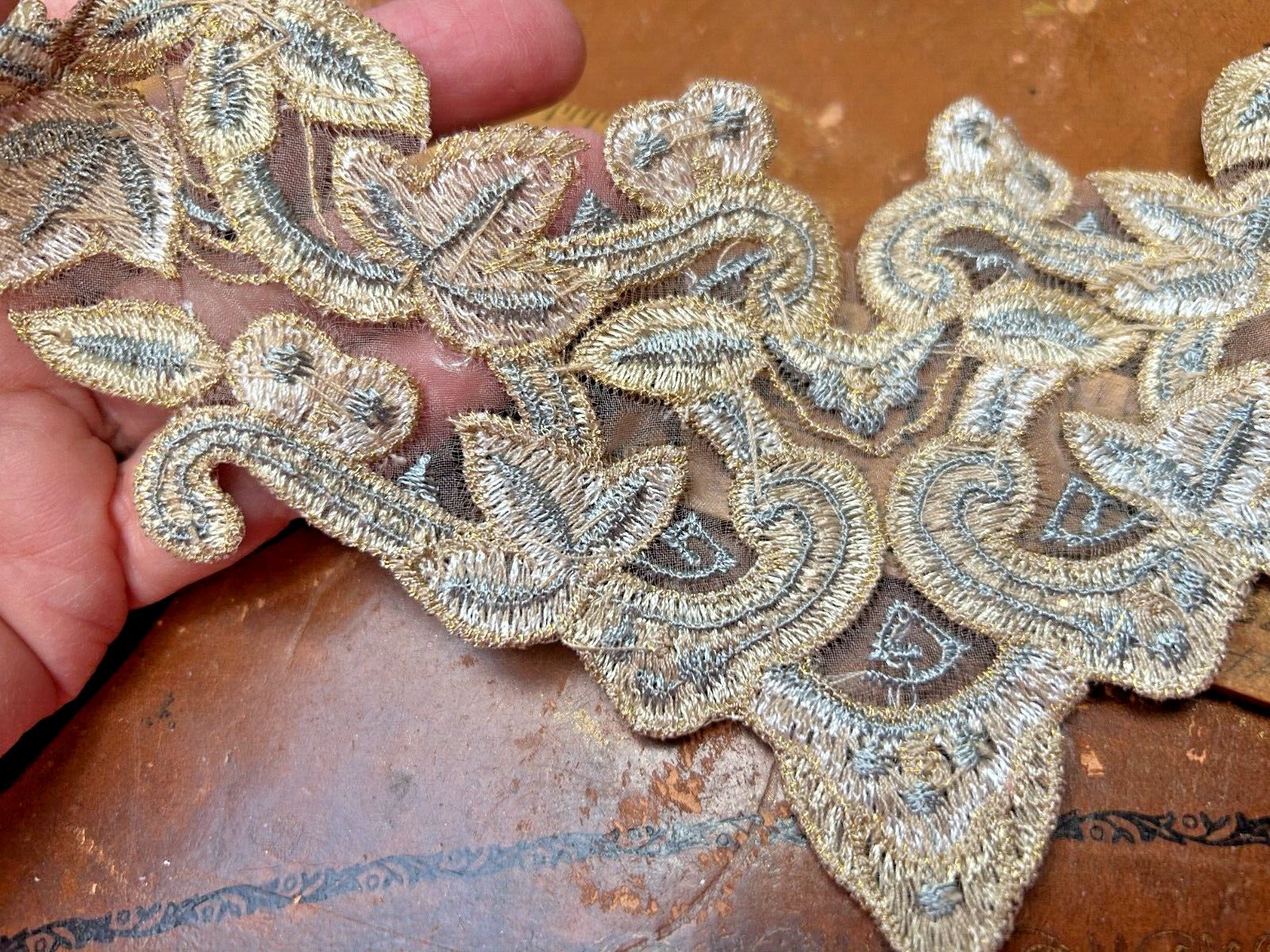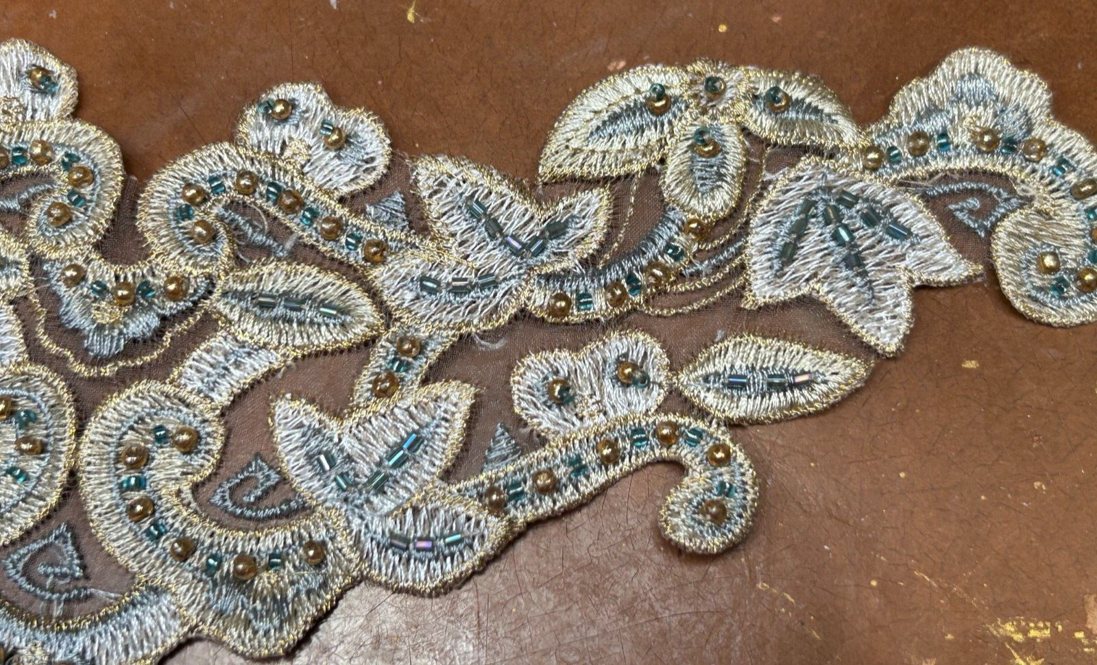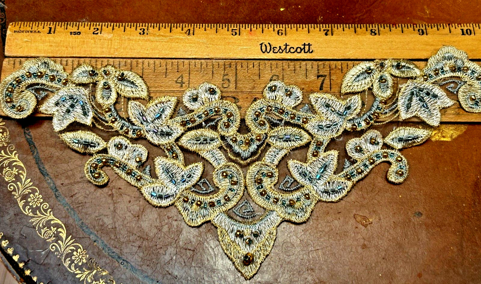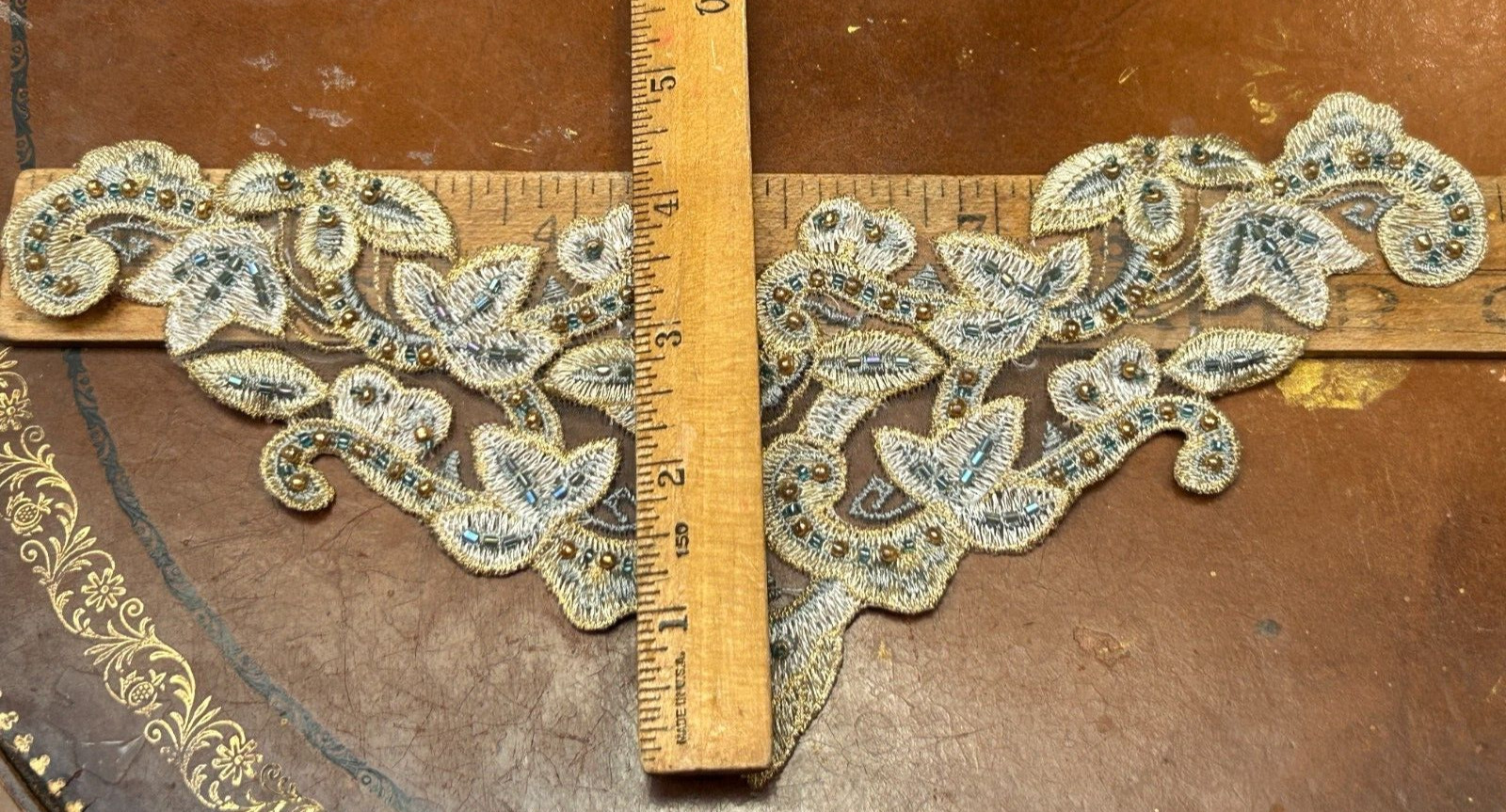beaded collar cotton metallic leaves 5x10.5 blue gold 1pc hand sewn