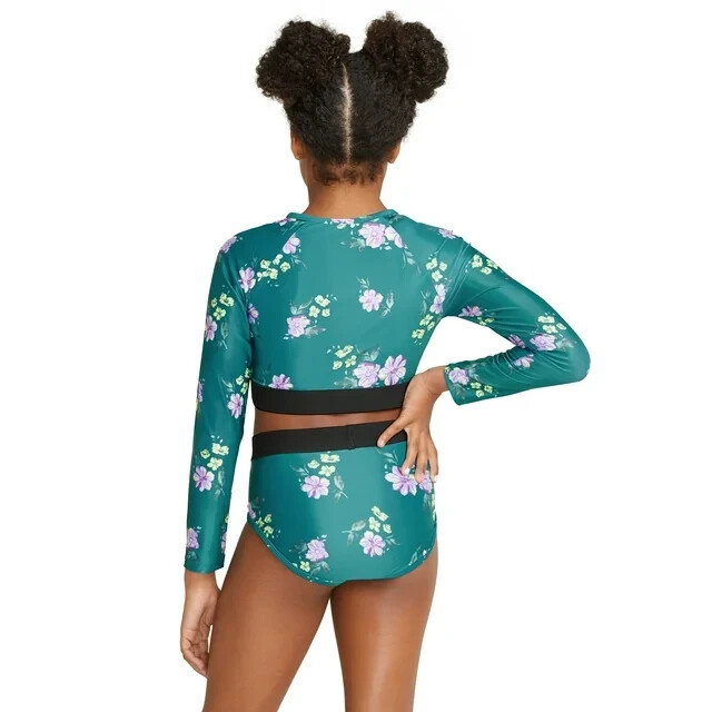 как выглядит Justice Girls 2 Pce Long Sleeve Elastic Trim Floral L Rash Guard Swimsuit --K8 фото