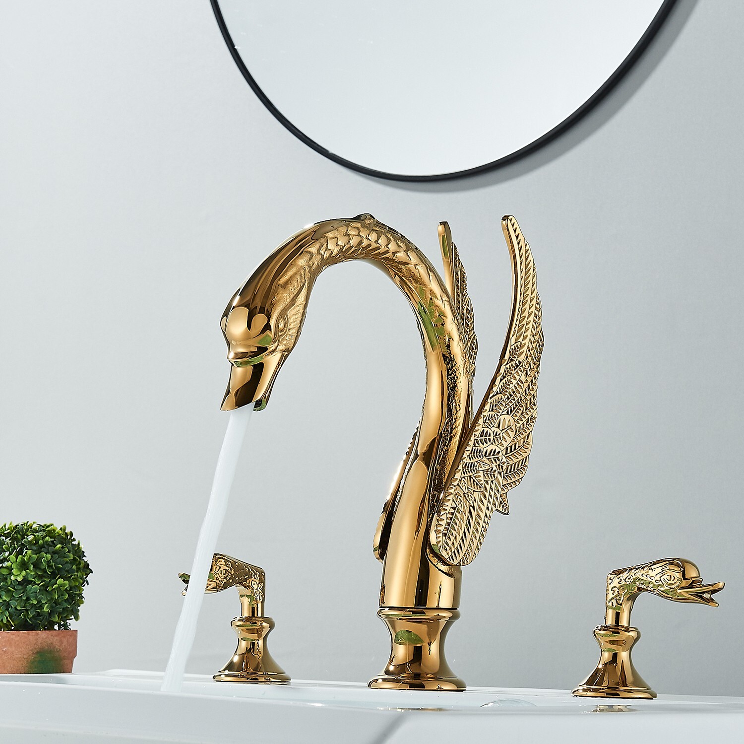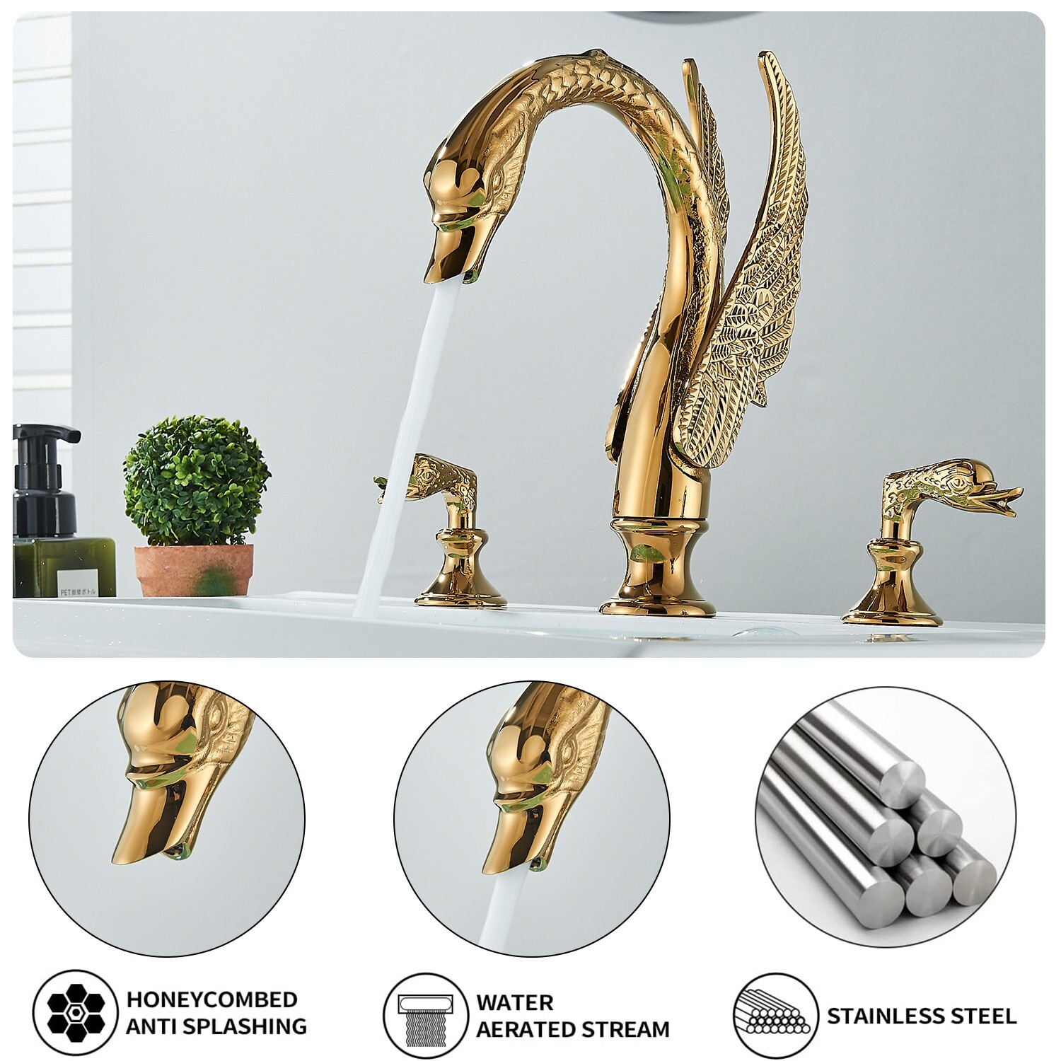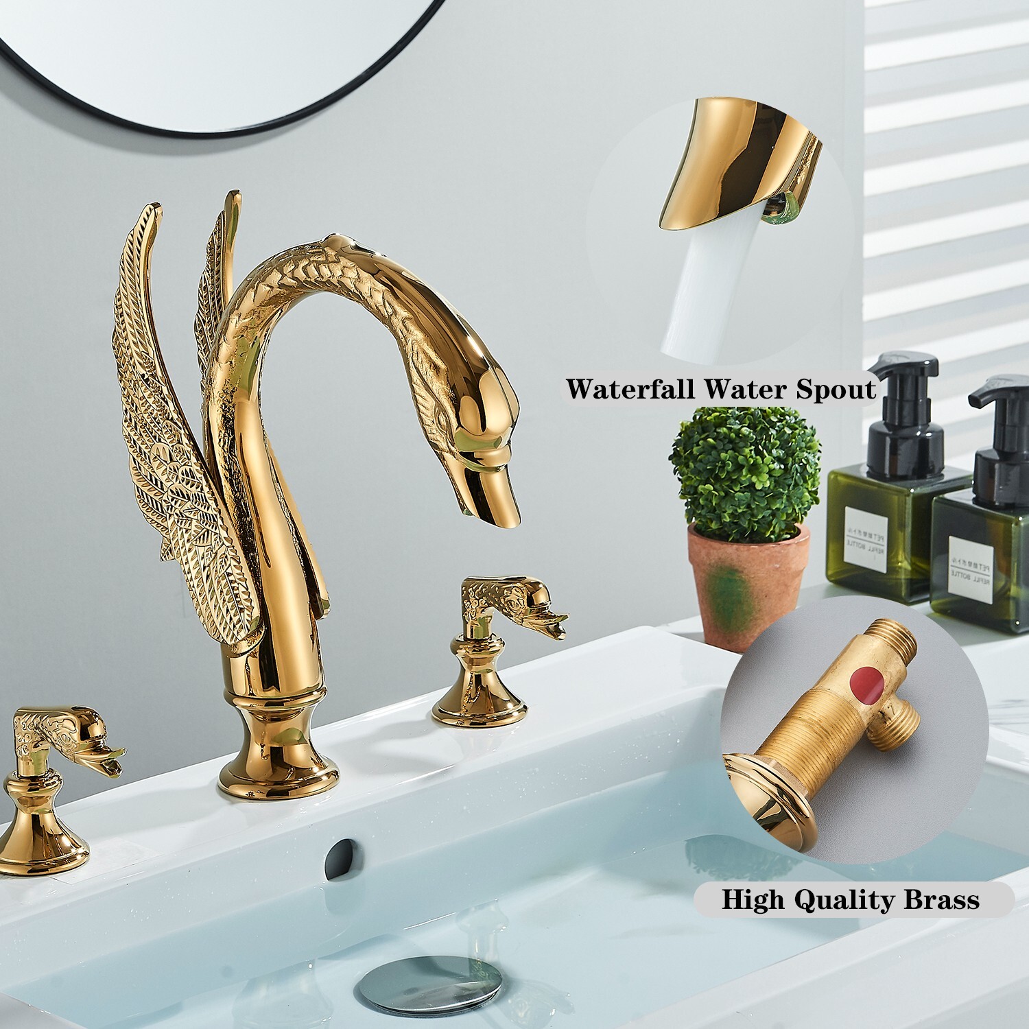 8'' Center Gold Bathroom Sink Faucet 3 Hole 2 Swan Handle Basin Vanity Mixer Tap
