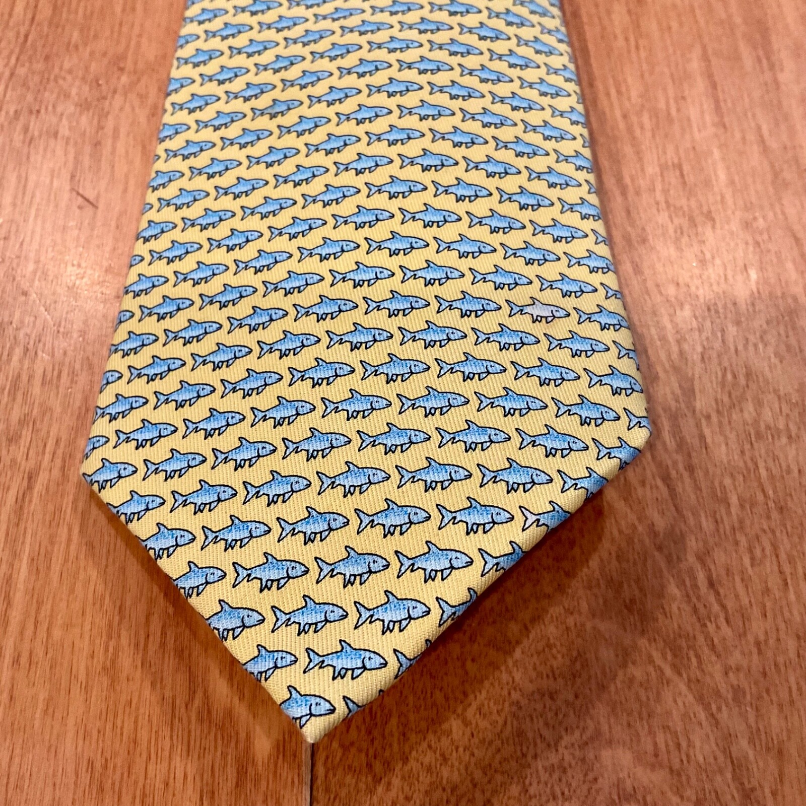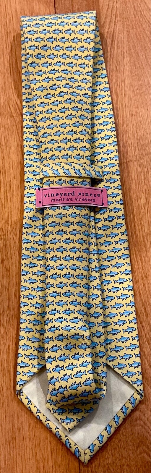 как выглядит VINEYARD VINES YELLOW SHARKS HAND PICKED BY SHEP IAN 100 SILK TIE GIFT фото