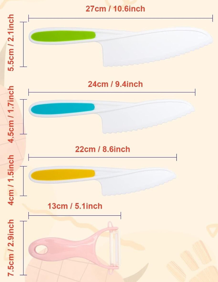 Set Includes: Chef's Knife, Knife Set, Slicer, Steak Knife, Safety Knives, Kids Knives, Cutting Board, Wood Knife, Potato Peeler