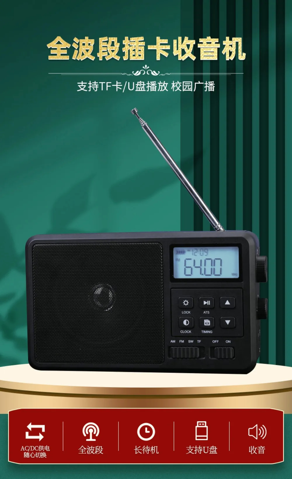 HRD-206 Radio FM AM SW Portable Radio LCD Screen Full Band Recording Speaker