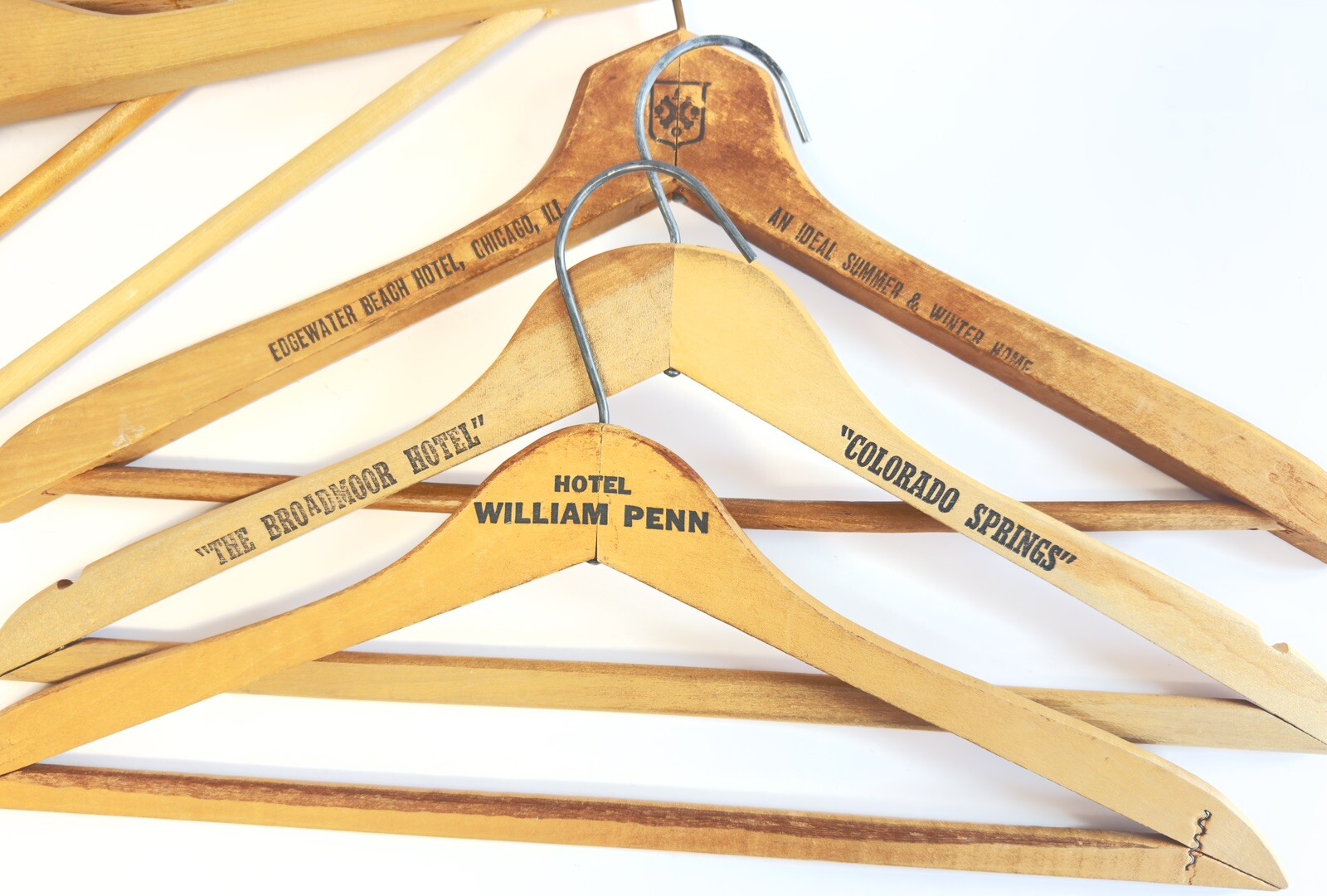Vintage MCM Wooden Motel Hotel Hangers Penn Edgewater Beach Broadmoore Lot
