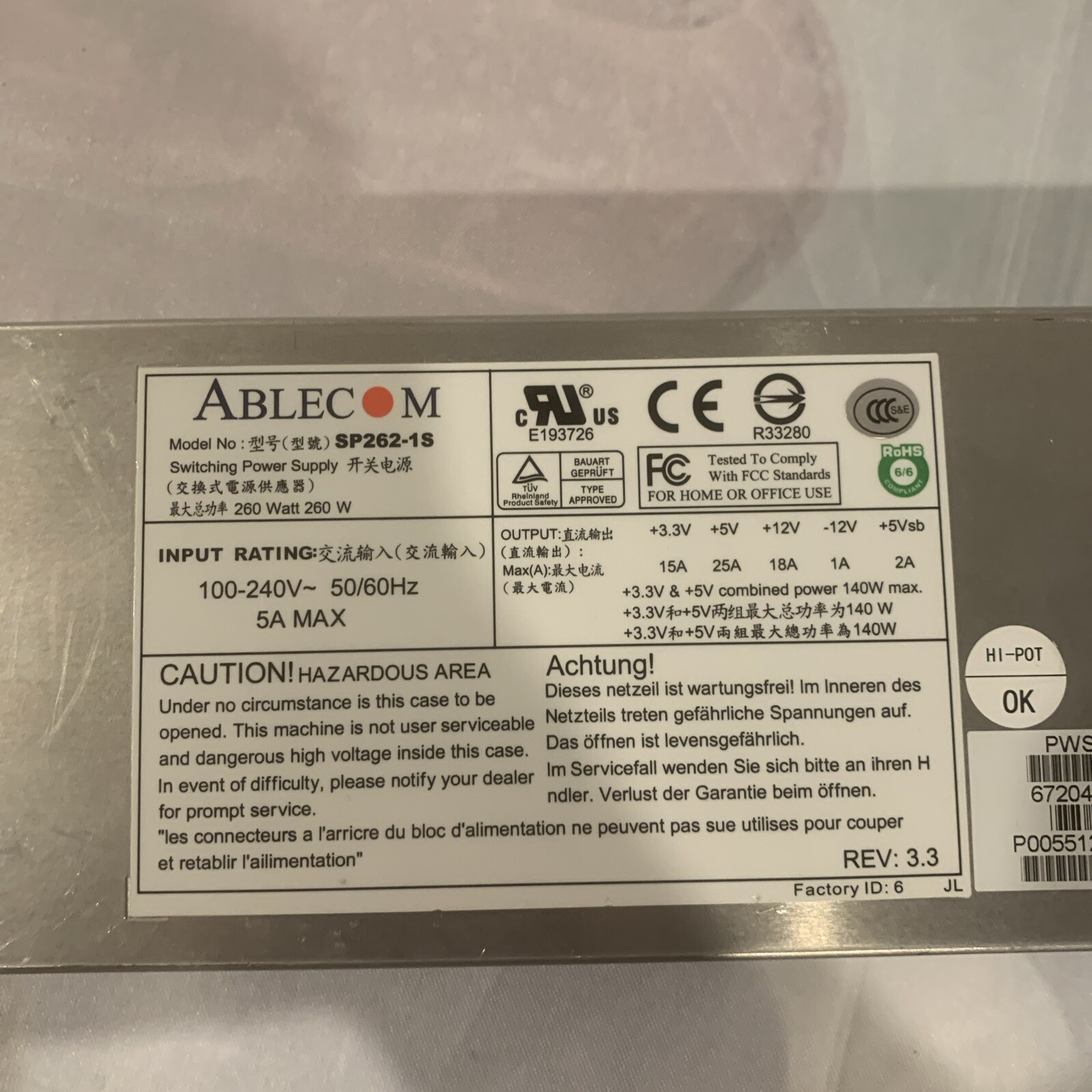 Ablecom SP262-1S SuperMicro PWS-0055 260W Switching Power Supply 24-PINS