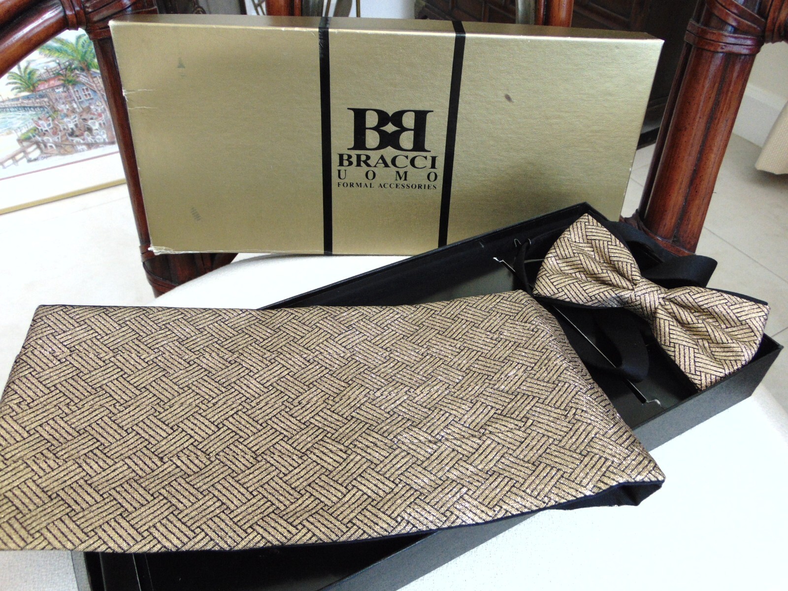 CUMMERBUND TIE SET GOLD W BLACK WEAVE FABRIC RECTANGLES by BRACCI UOMO new