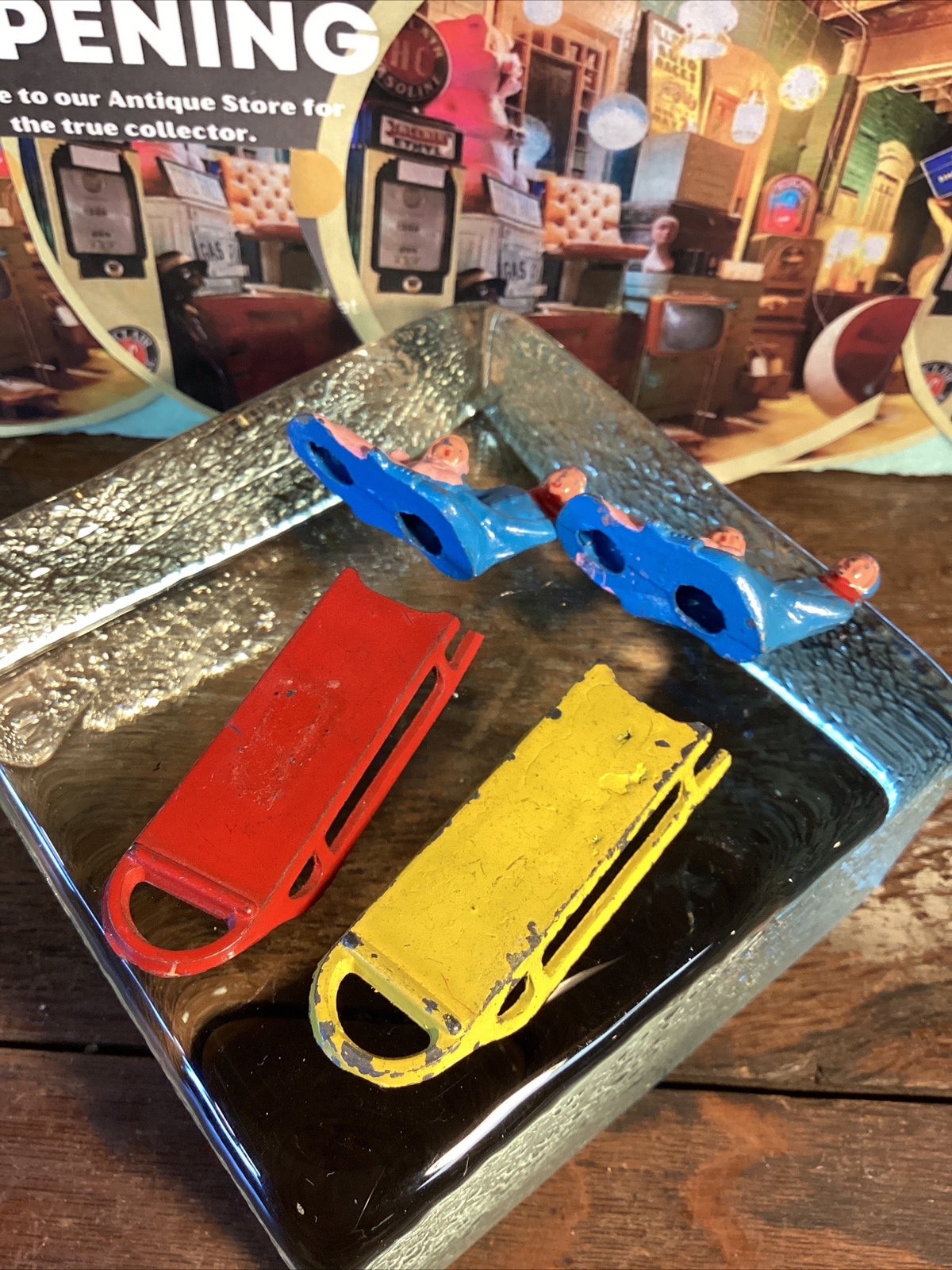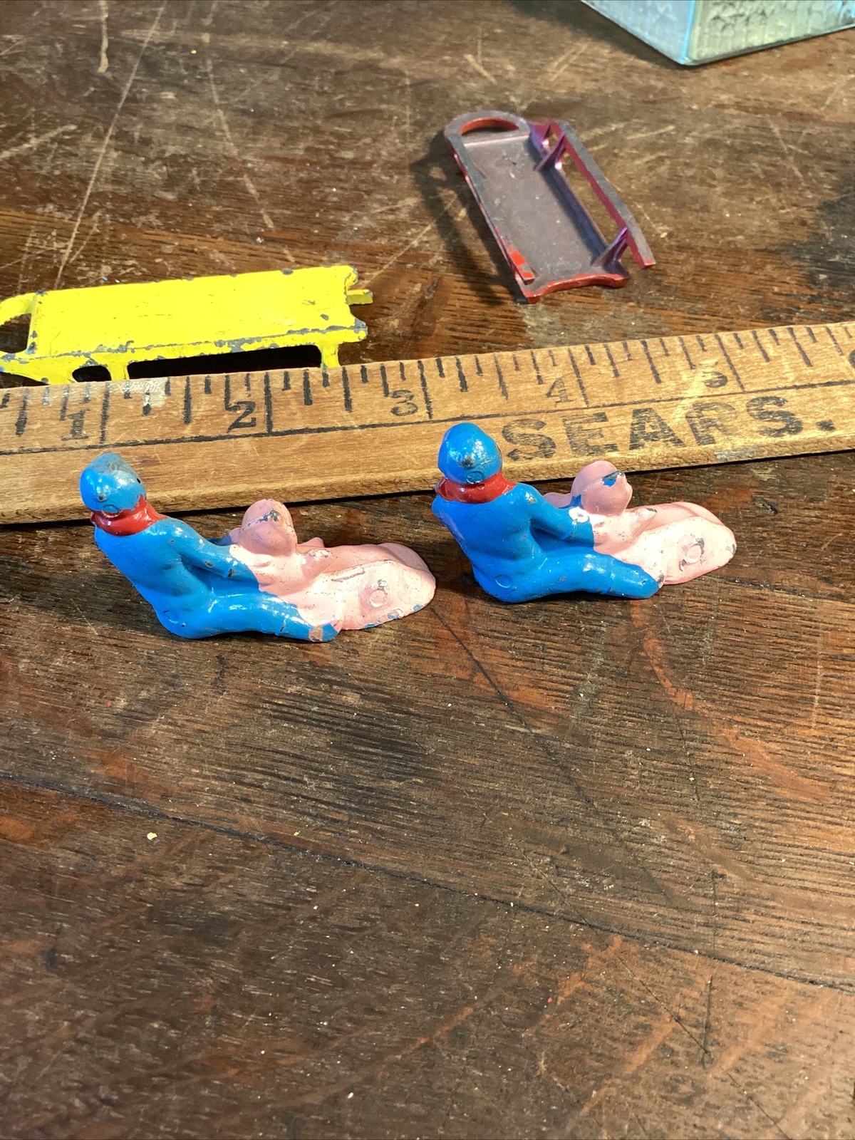 Vintage Barclay Sled Cast Lead Figures Sled Winter Village Sledding Baby Red Old
