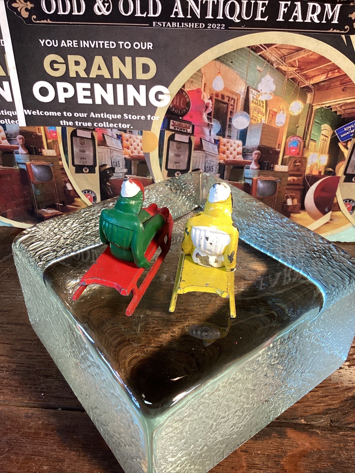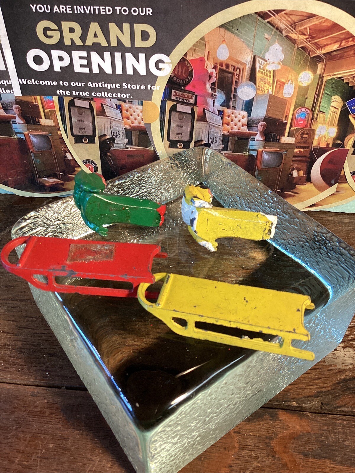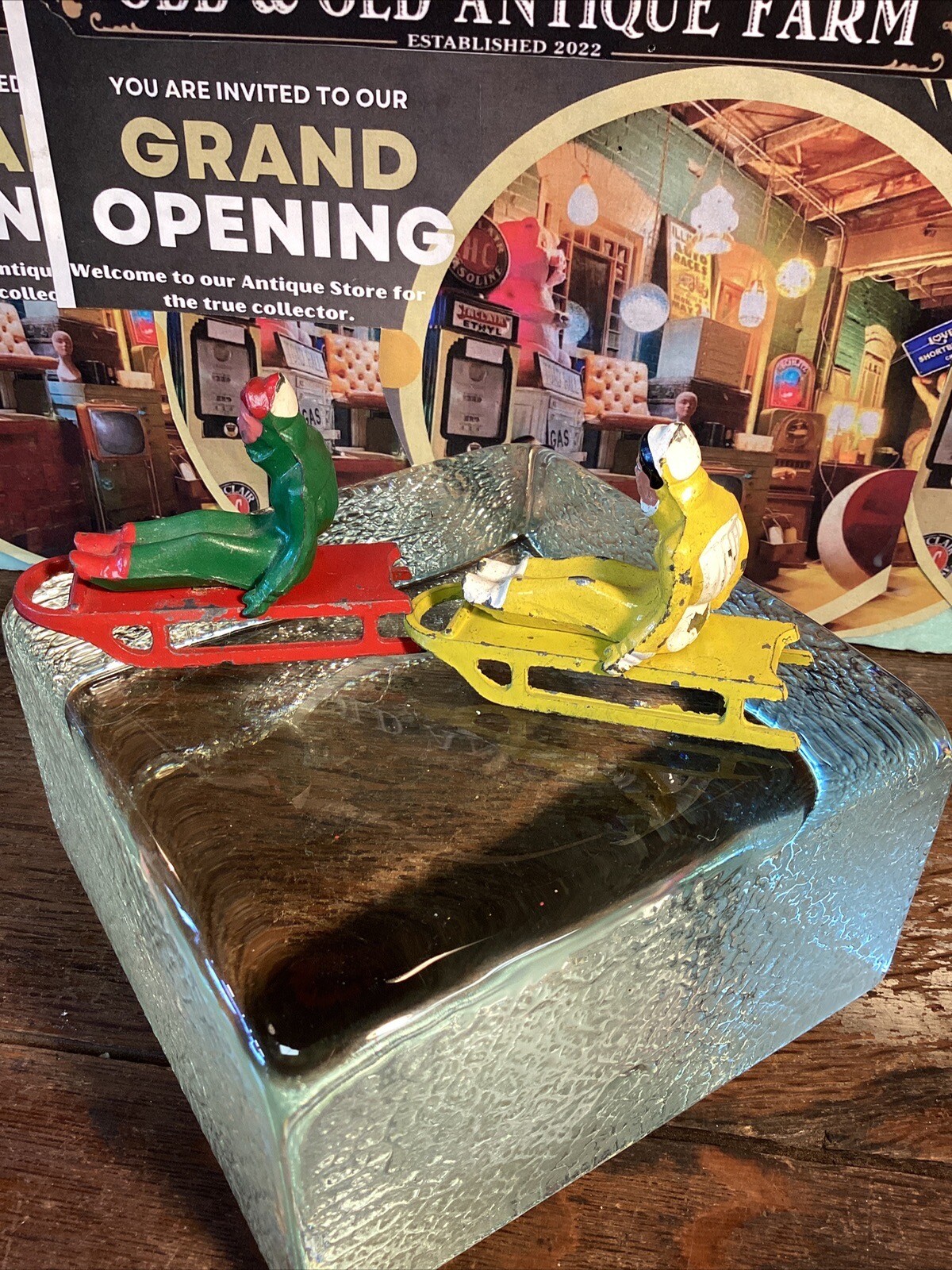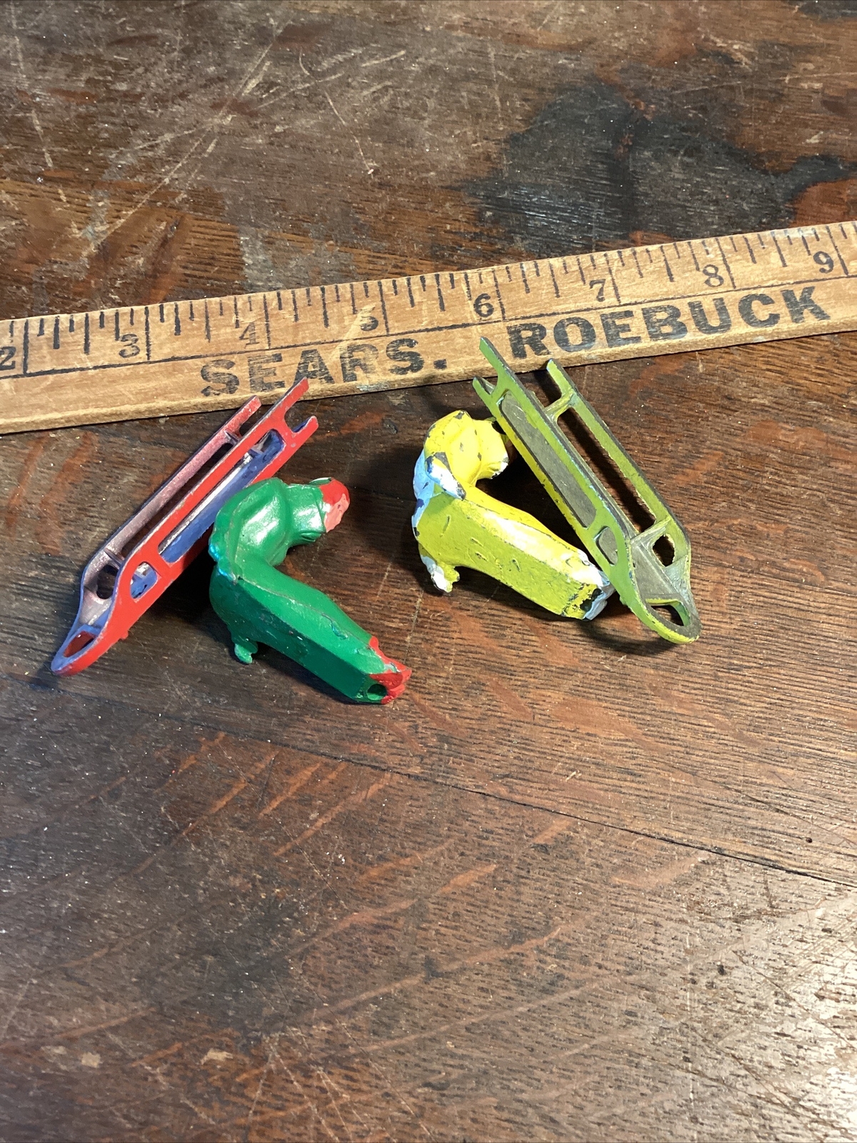 как выглядит Vintage 2 Barclay Sled Cast Lead Figures Man Winter Village Sledding Red Woman фото
