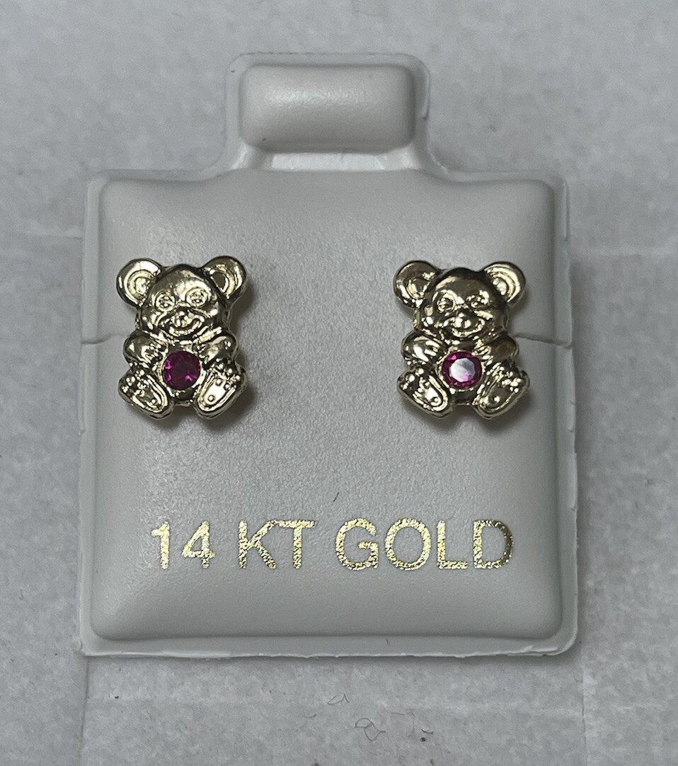 Teddy Bear Red Stud Earrings 14K Solid Gold With Safety Backing