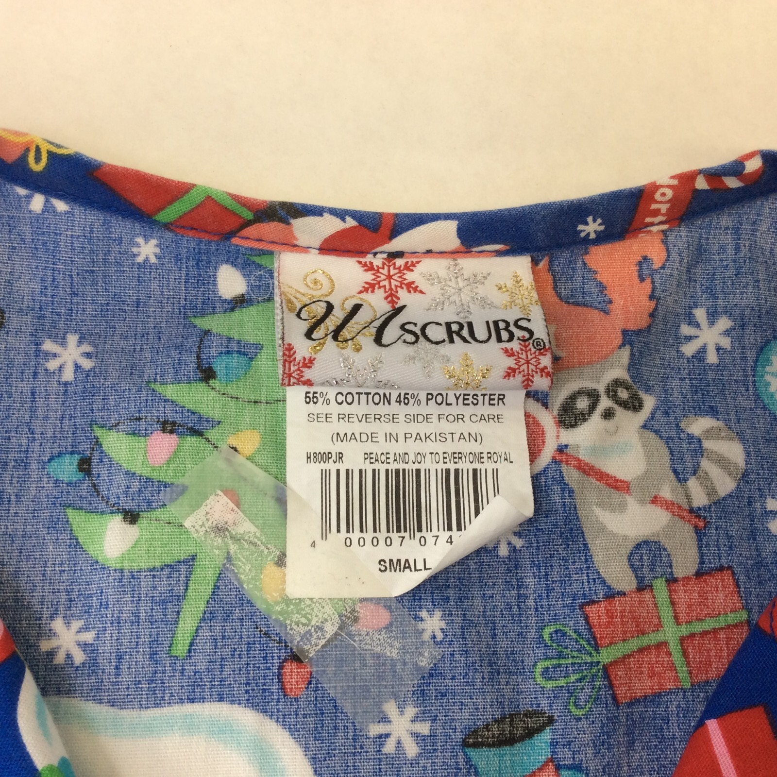 UA Scrub Top Christmas Size S Scrubs Blue Sleigh Trees Snowman Cotton Blend LS
