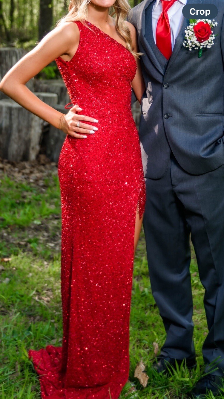 как выглядит Amazing Red Prom Dress Gown Ashley Lauren Size 00 One Shoulder Long Slit Lace фото