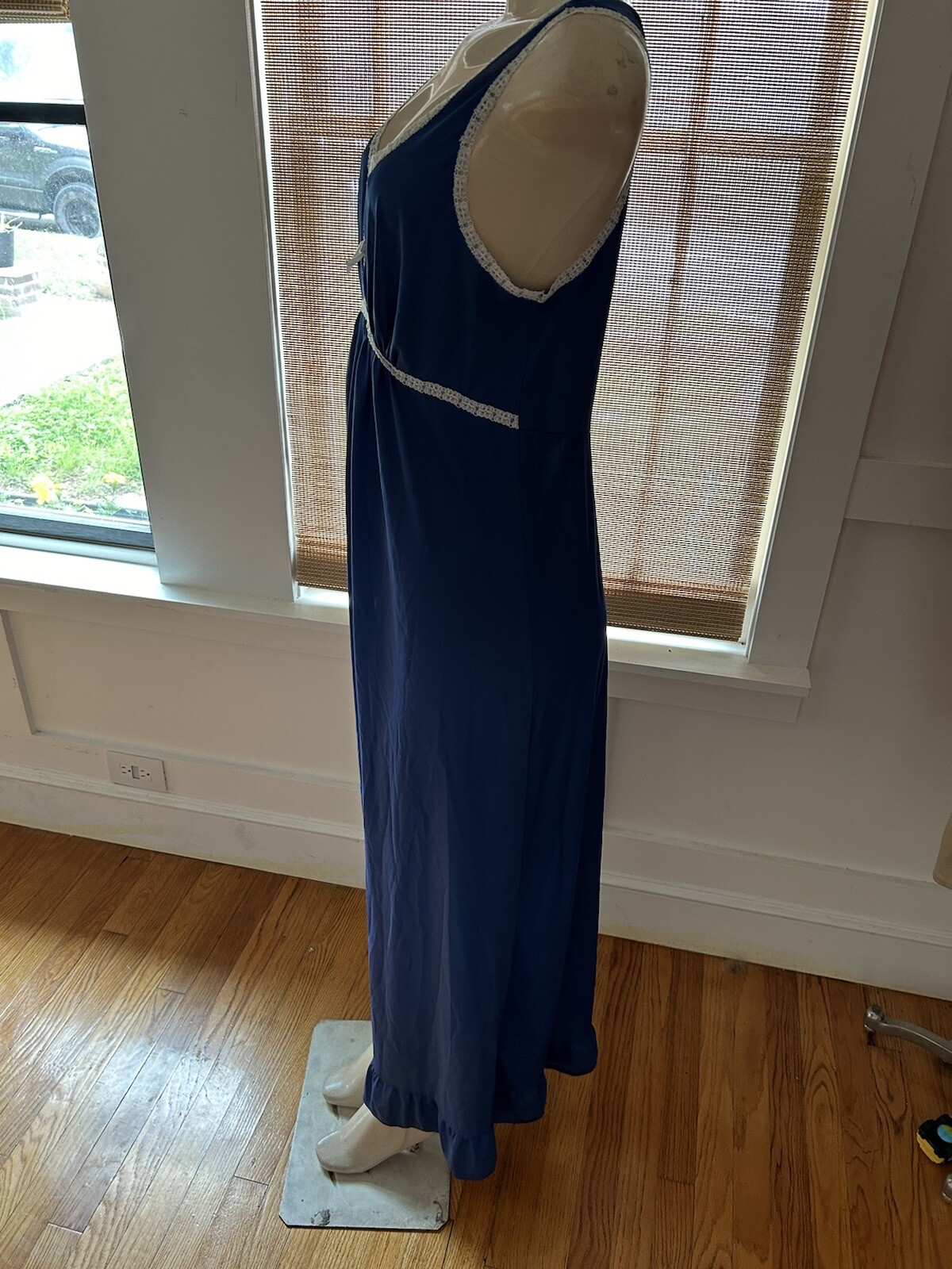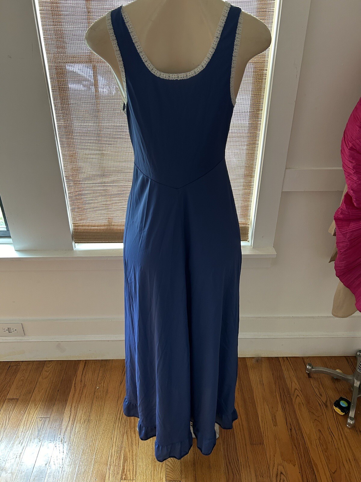 как выглядит Vtg 70s Formfit Rogers blue long nylon nightgown Empire white lace Deep V SZ S фото