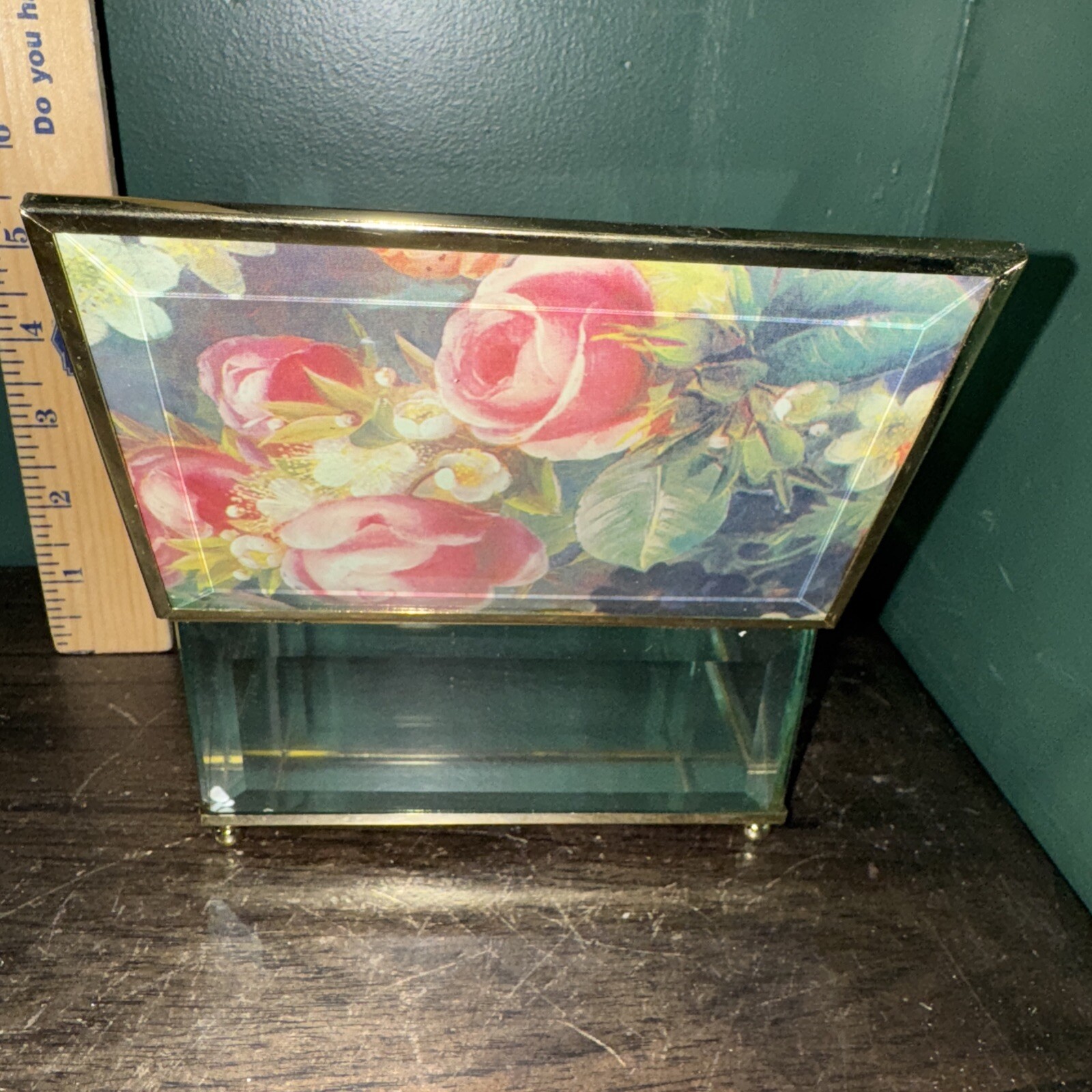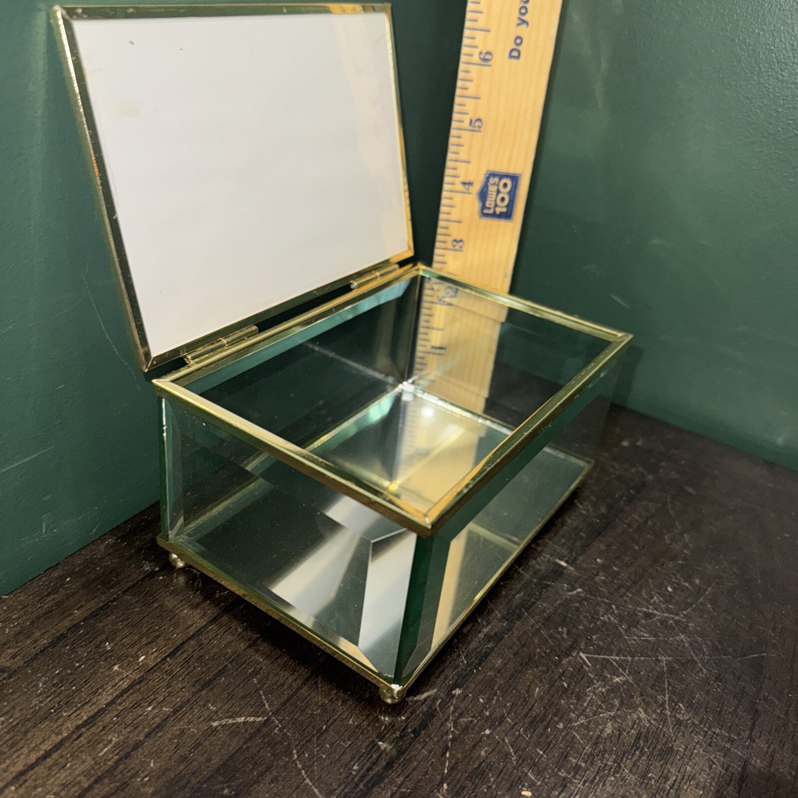 Vtg Beveled Glass Brass Floral Hinged Footed Jewelry Trinket Box w/Mirror Base