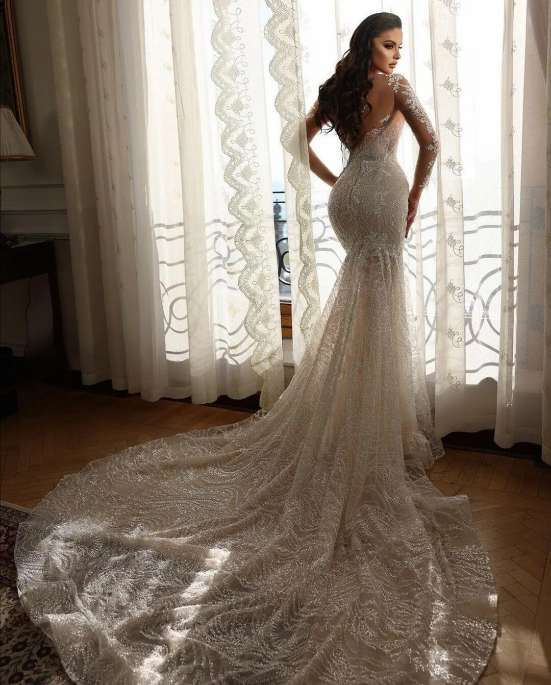 как выглядит Elegant Mermaid Wedding Dresses V-Neck Long Sleeved Lace Appliques Bridal Gowns фото