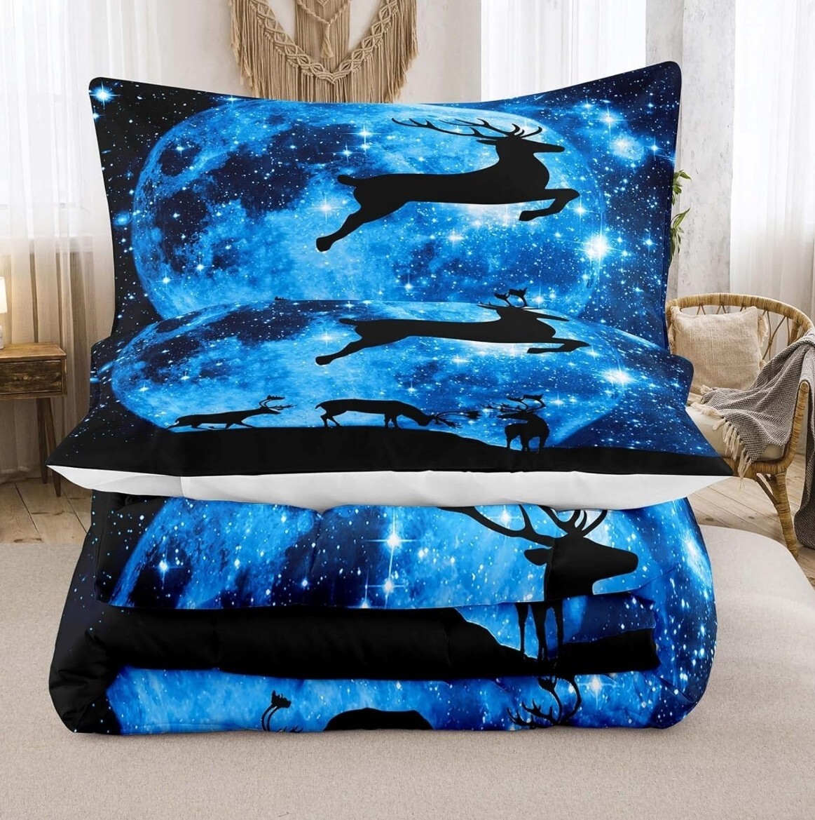 NINENINE Galaxy Deer Comforter Queen Size for Boys Girls Kids, Blue Moonlight