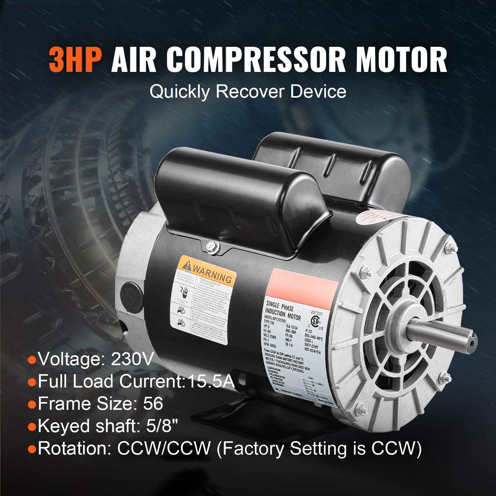 Uimoso 3HP Air Compressor Electric Motor 230V 3450RPM 56 Frame CW/CCW Rotation