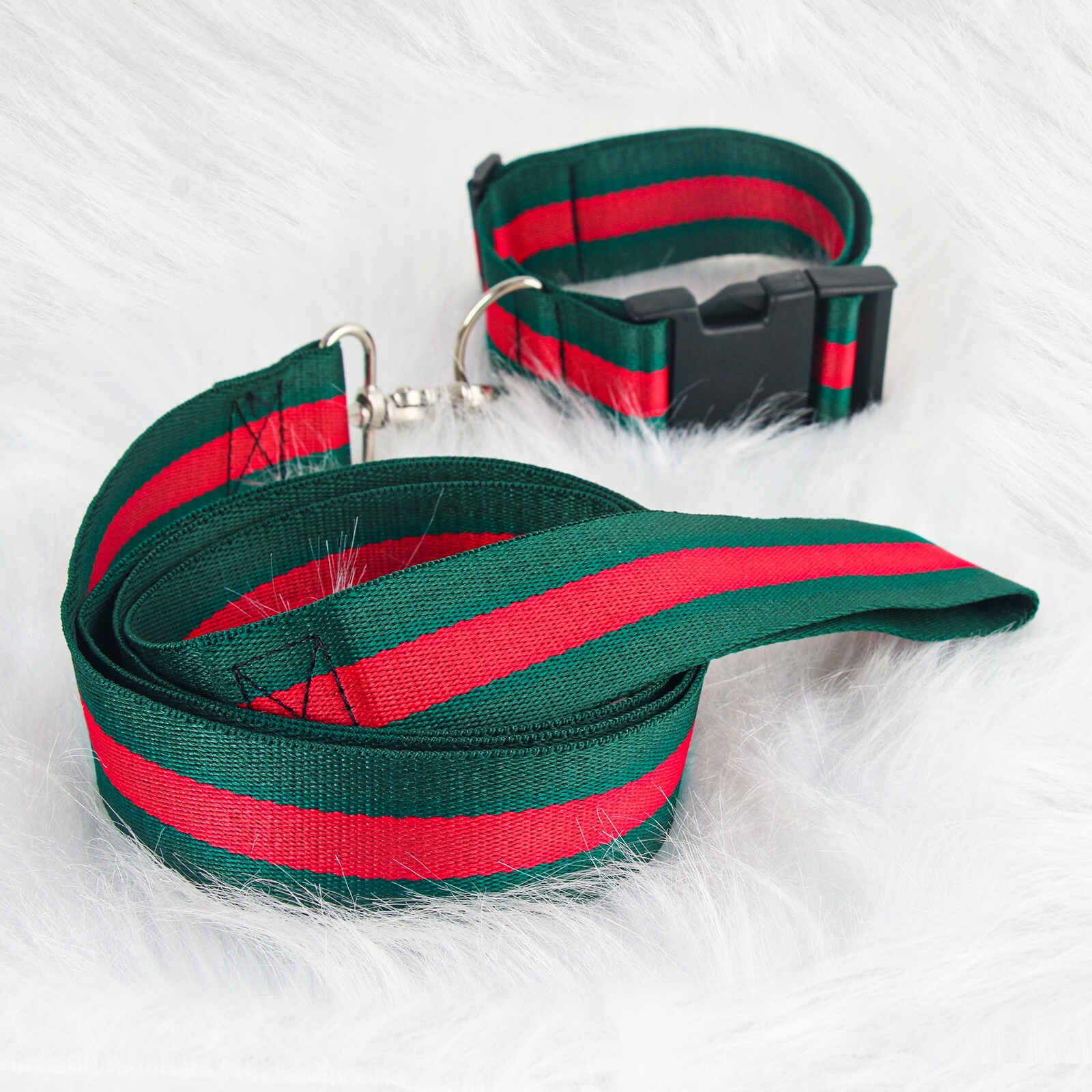2PCS Luxury Green and Red Stripe Designer Collar Lead Leash for M Large Dogs