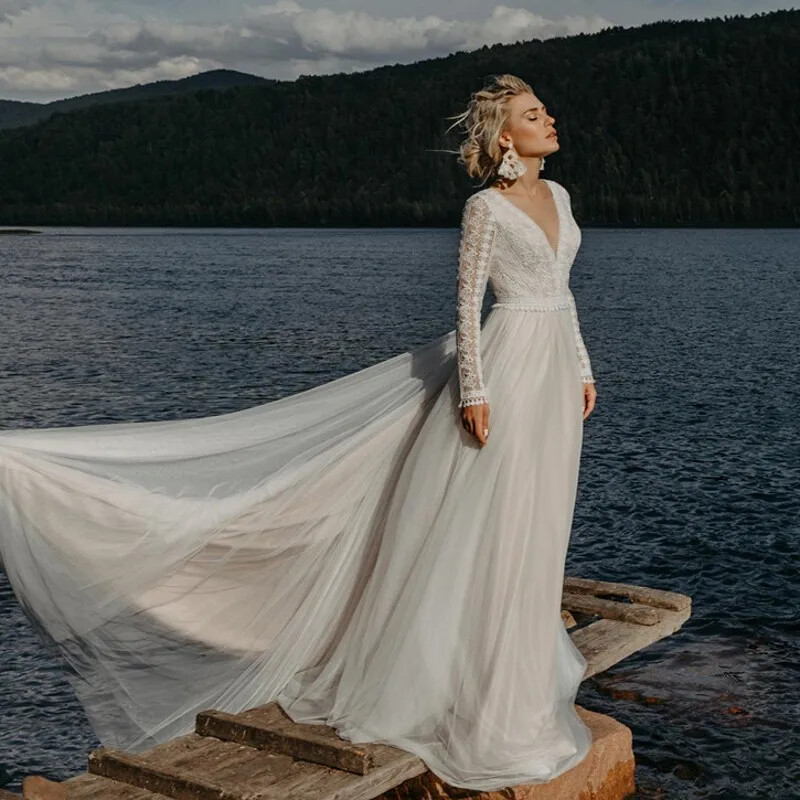 Elegant A-Line Wedding Dresses V-Neck Long Sleeved Lace Appliques Bridal Gowns