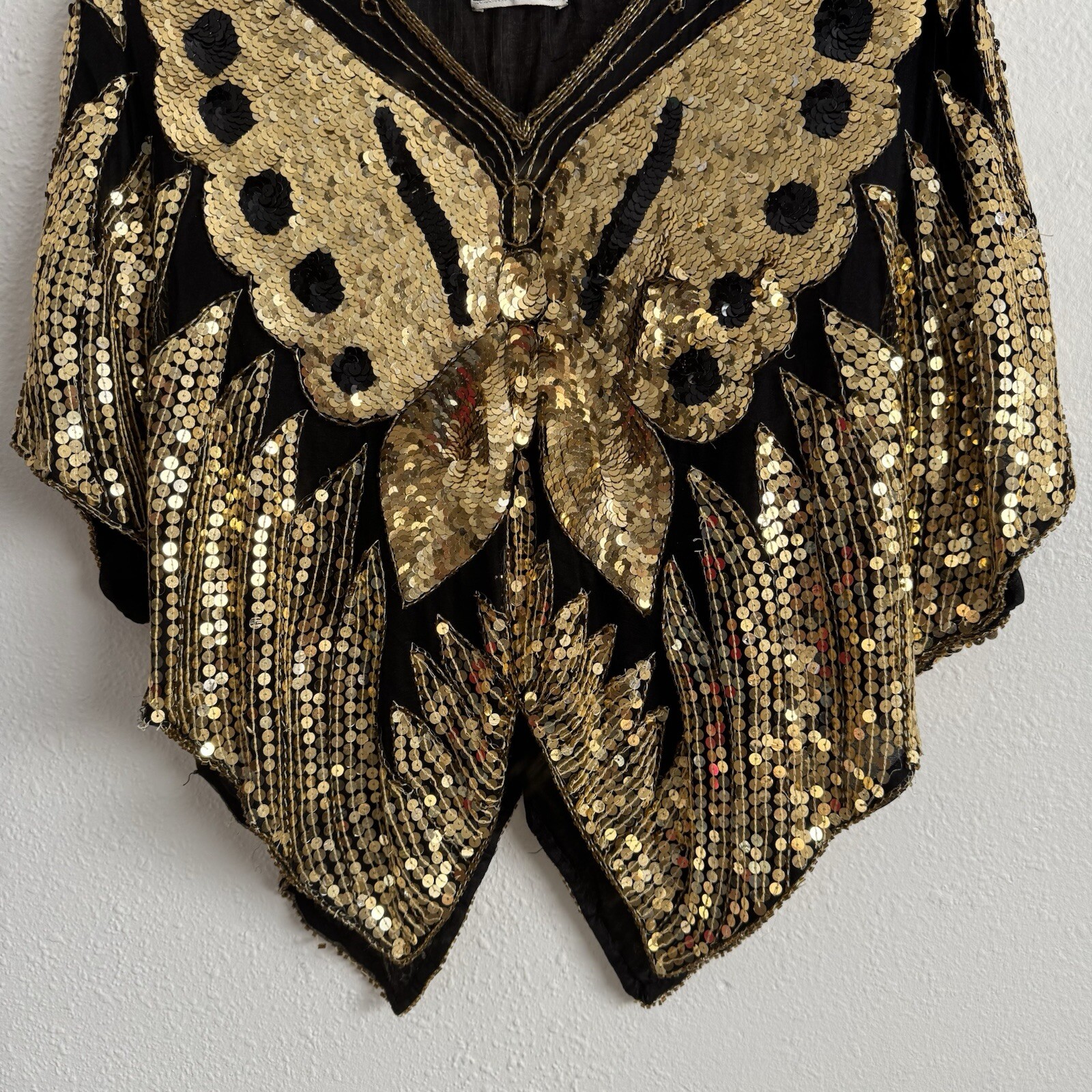 Vintage 70s Gold Black Silk Sequin Beaded Butterfly Boho Disco V Neck Drape Top
