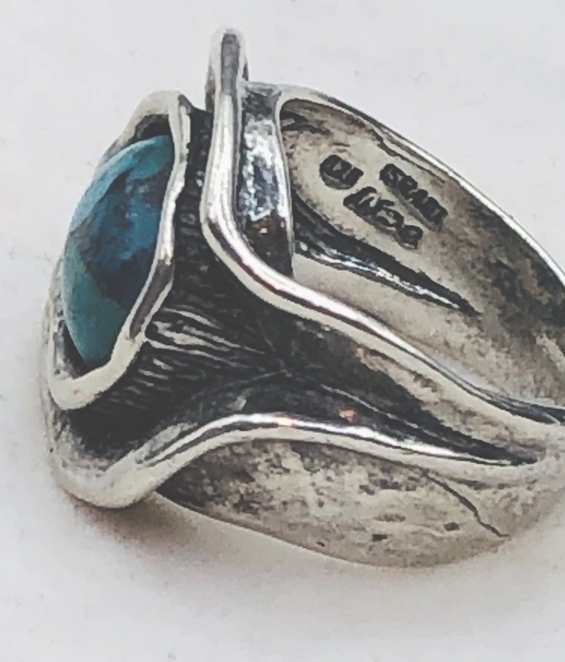 как выглядит Modernist Sterling Israeli Ring w. Composite Turquoise Artisan Signed Sz. 6 фото