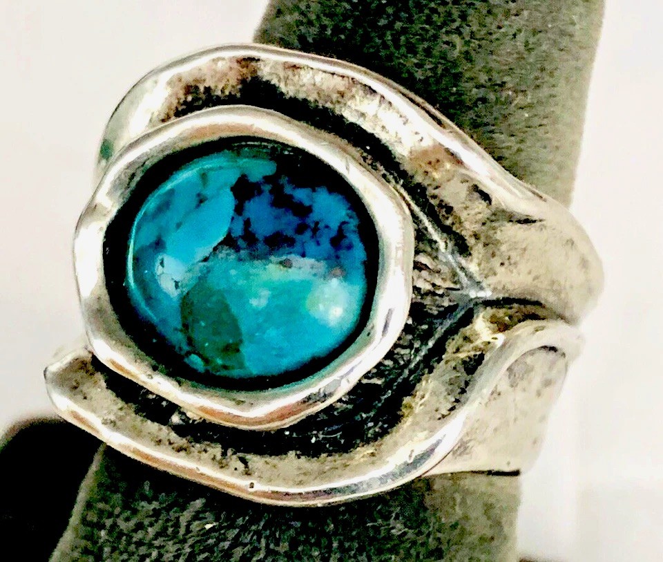 Modernist Sterling Israeli Ring w. Composite Turquoise Artisan Signed Sz. 6