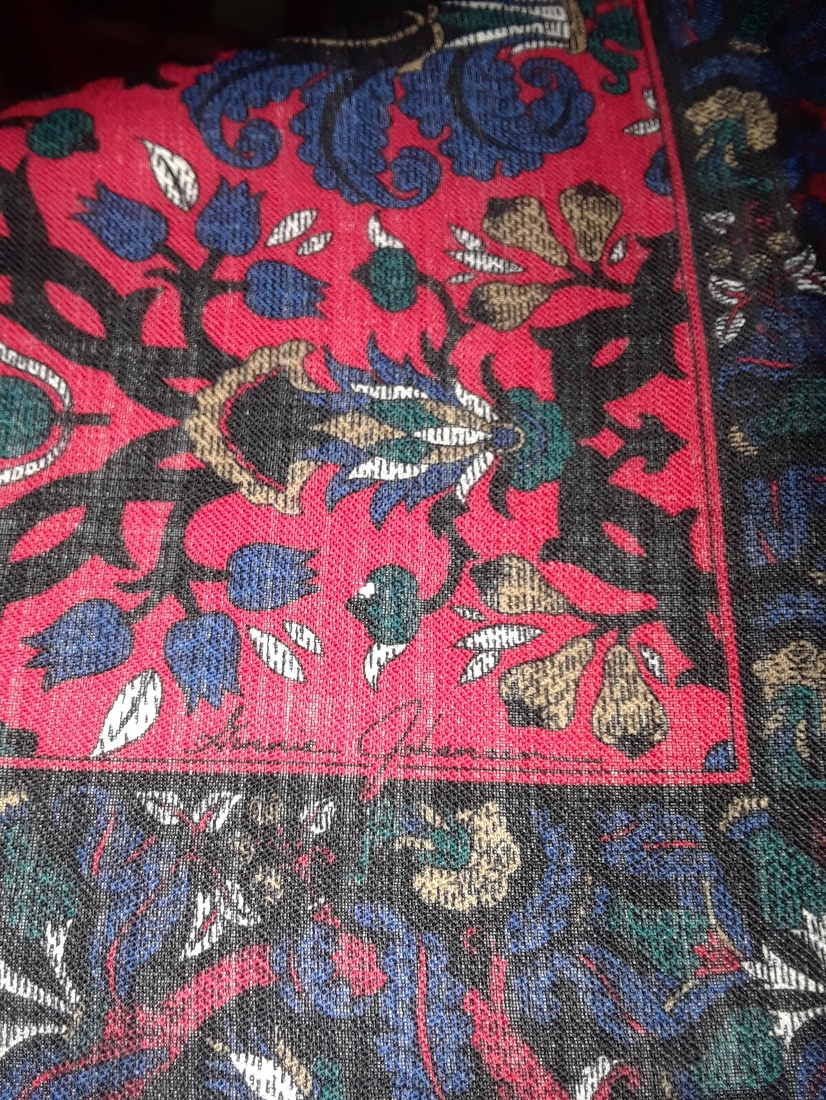 как выглядит Vintage Ginnie Johansen Blue Red Ornate 100 Wool Square Scarf 34" Japan фото