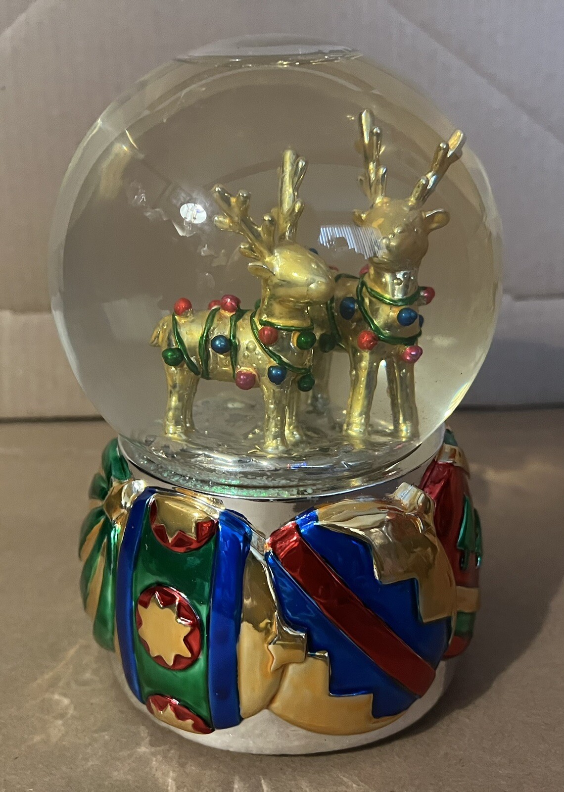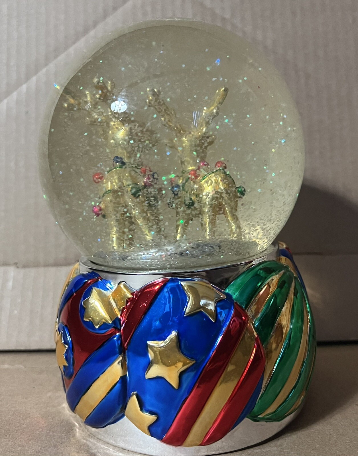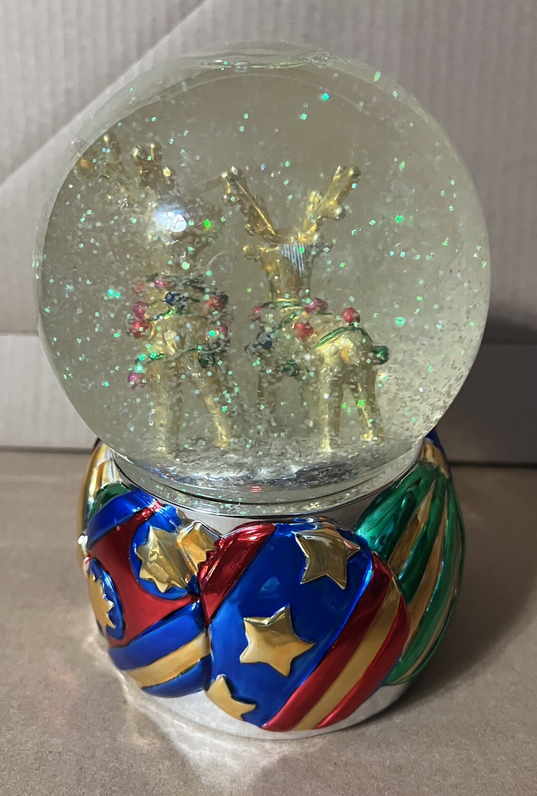 как выглядит Vntg Golden Reindeer Musical Snow Glitter Globe Wind-Up Plays Deck the Halls фото