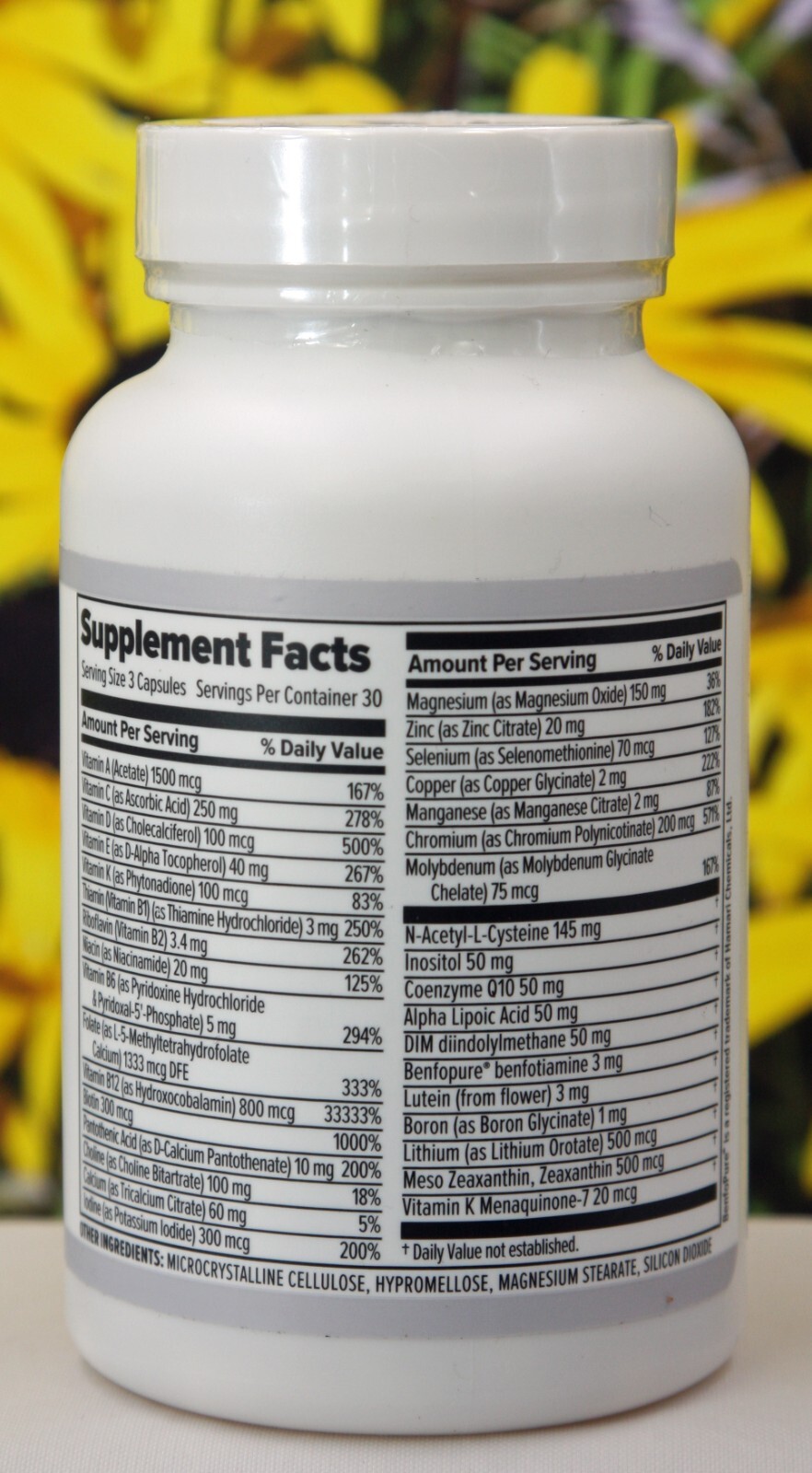 Active Ingredients: Biotin, Calcium, Choline, Chromium, Copper, Iodine, Magnesium, Manganese, Molybdenum, Selenium, Vitamin A, Vitamin B1 (Thiamine), Vitamin B12, Vitamin B2 (Riboflavin), Vitamin B3 (Niacin), Vitamin B5 (Pantothenic Acid), Vitamin B6, Vitamin C (Ascorbic Acid), Vitamin D, Vitamin E, Vitamin K, Zinc, Thiamin, Folate