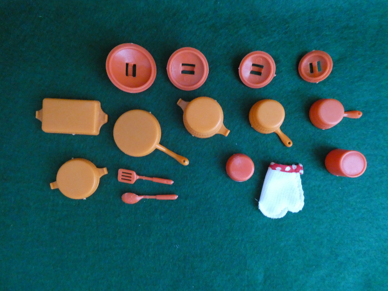 VTG BARBIE DOLL COOKWARE SET, UTENSILS, POTHOLDER MITT, 1970'S
