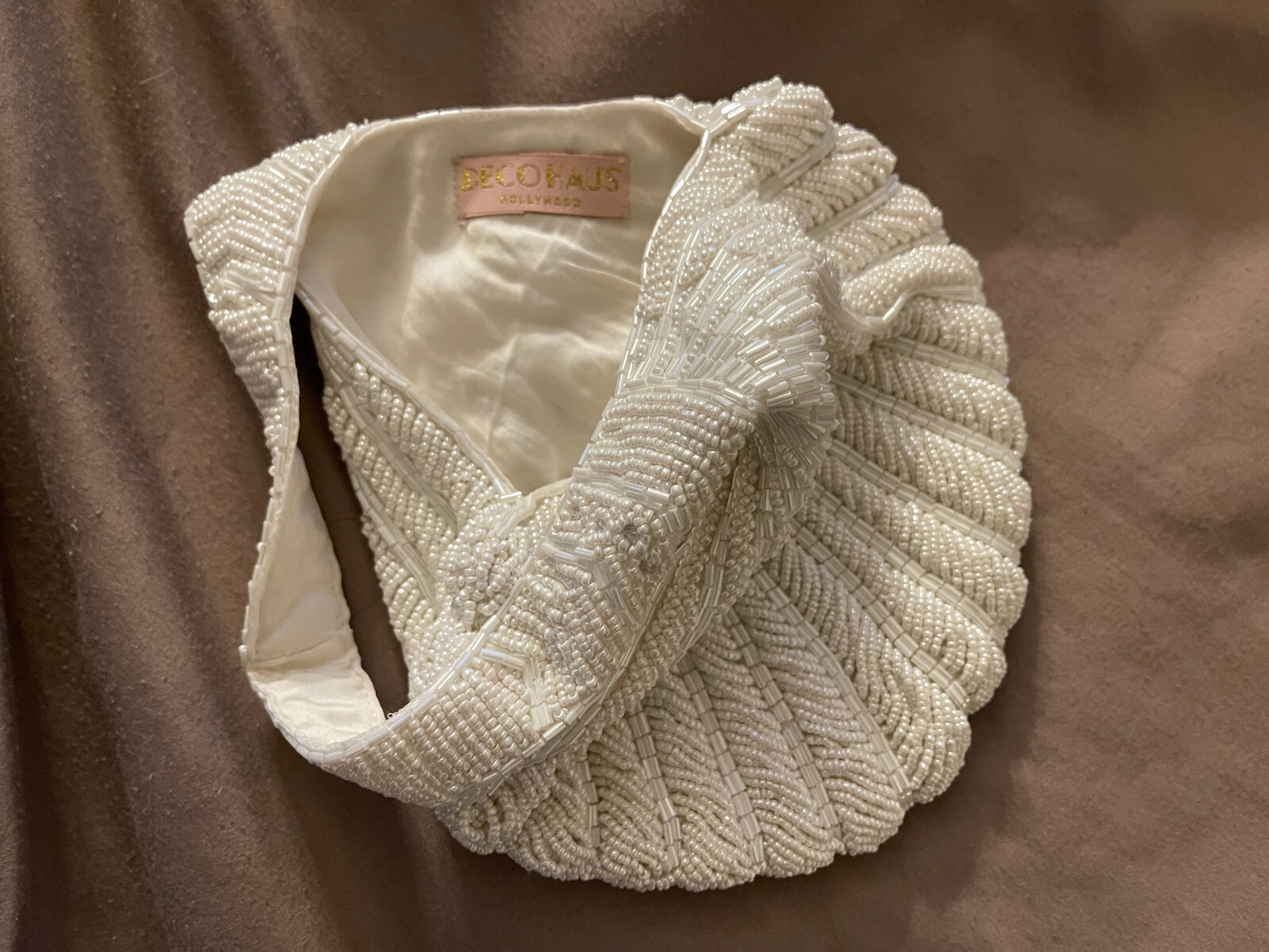 как выглядит 1920s Hand Beaded Fan Wristlet Evening Tote Deco Haus White Large purse bridal фото