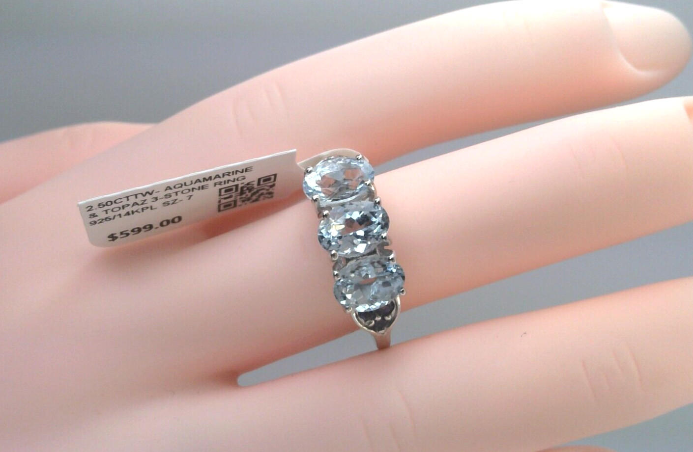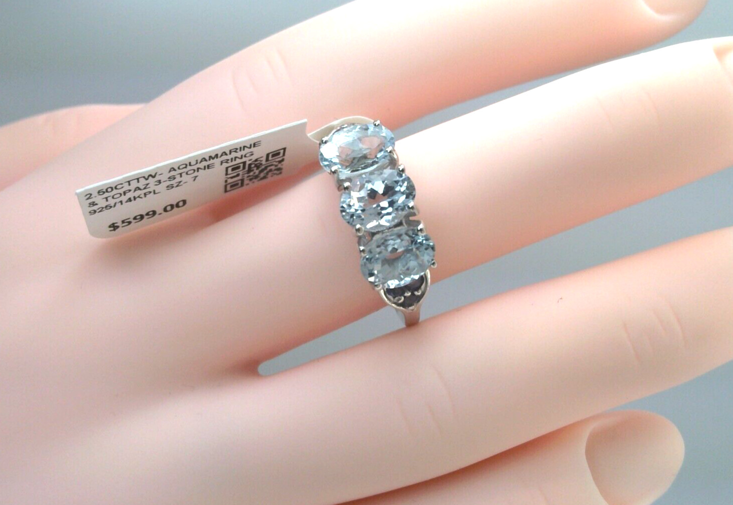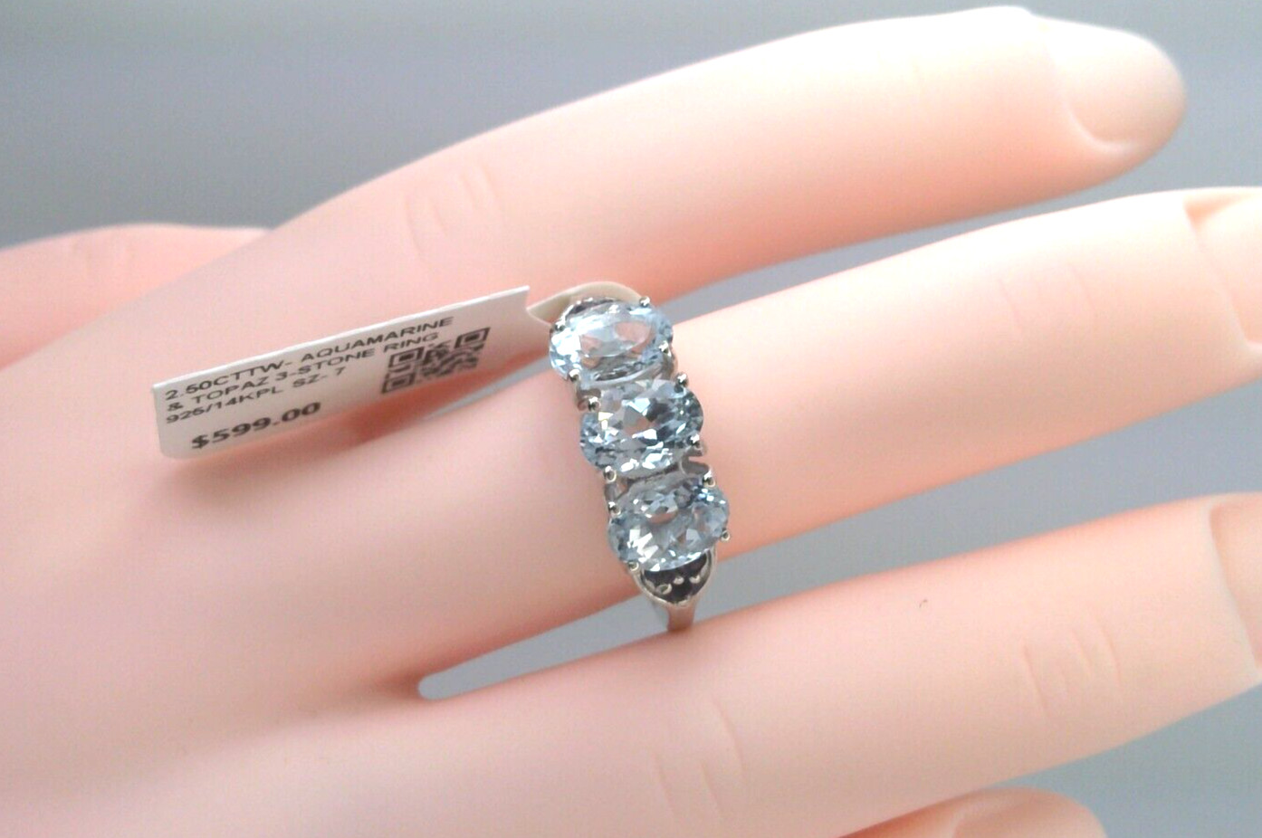 599 - 2.50CT Natural Aquamarine Blue Topaz 3 STONE Ring, SS/925/14k P- SIZE 7
