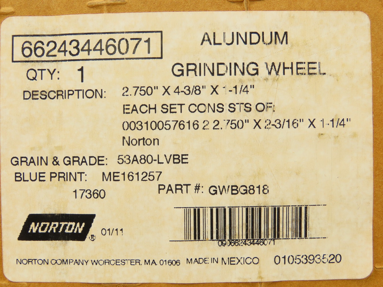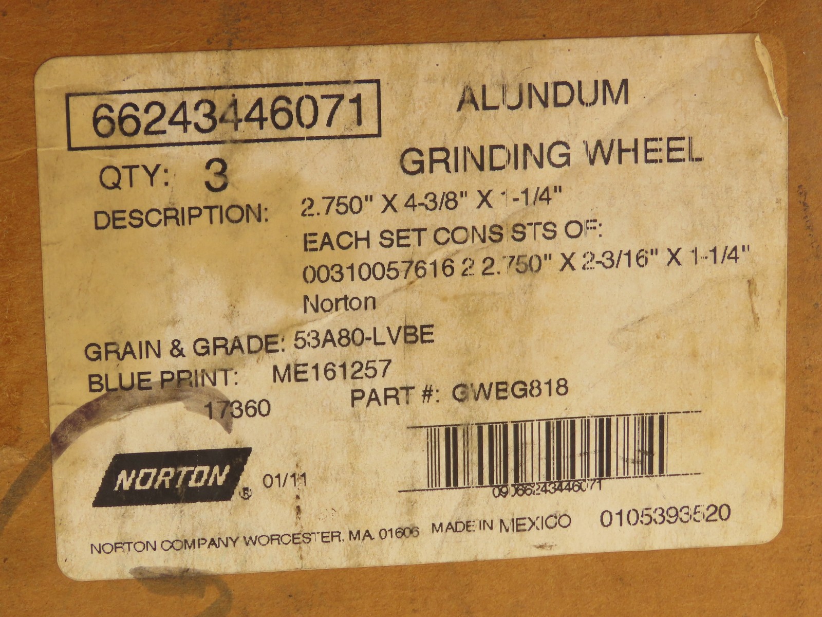 Norton GWBG-818 Alundum Grinding Wheel 2.75x4-3/8x1-1/4 17360 RPM Lot of 3 Sets