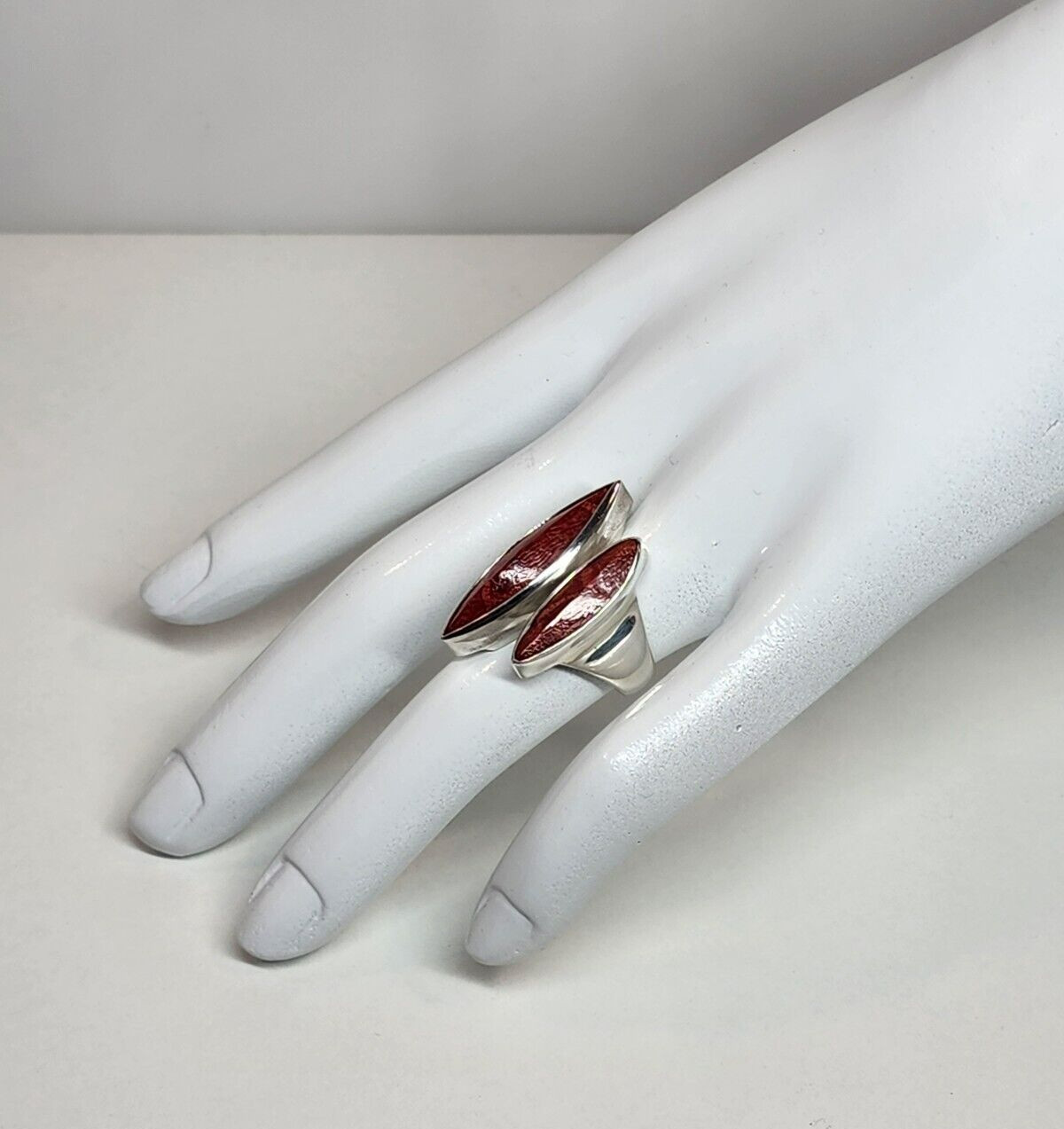 Double Marquise Red Sponge Coral Statement Ring Bali Handcrafted Silver Size 6
