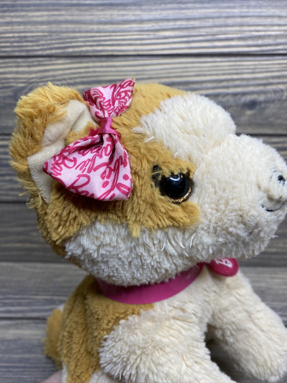 как выглядит Vtg Mattel Barbie Tan White Puppy Dog Pink Bow Stuffed Animal Lovey Plush 11 фото