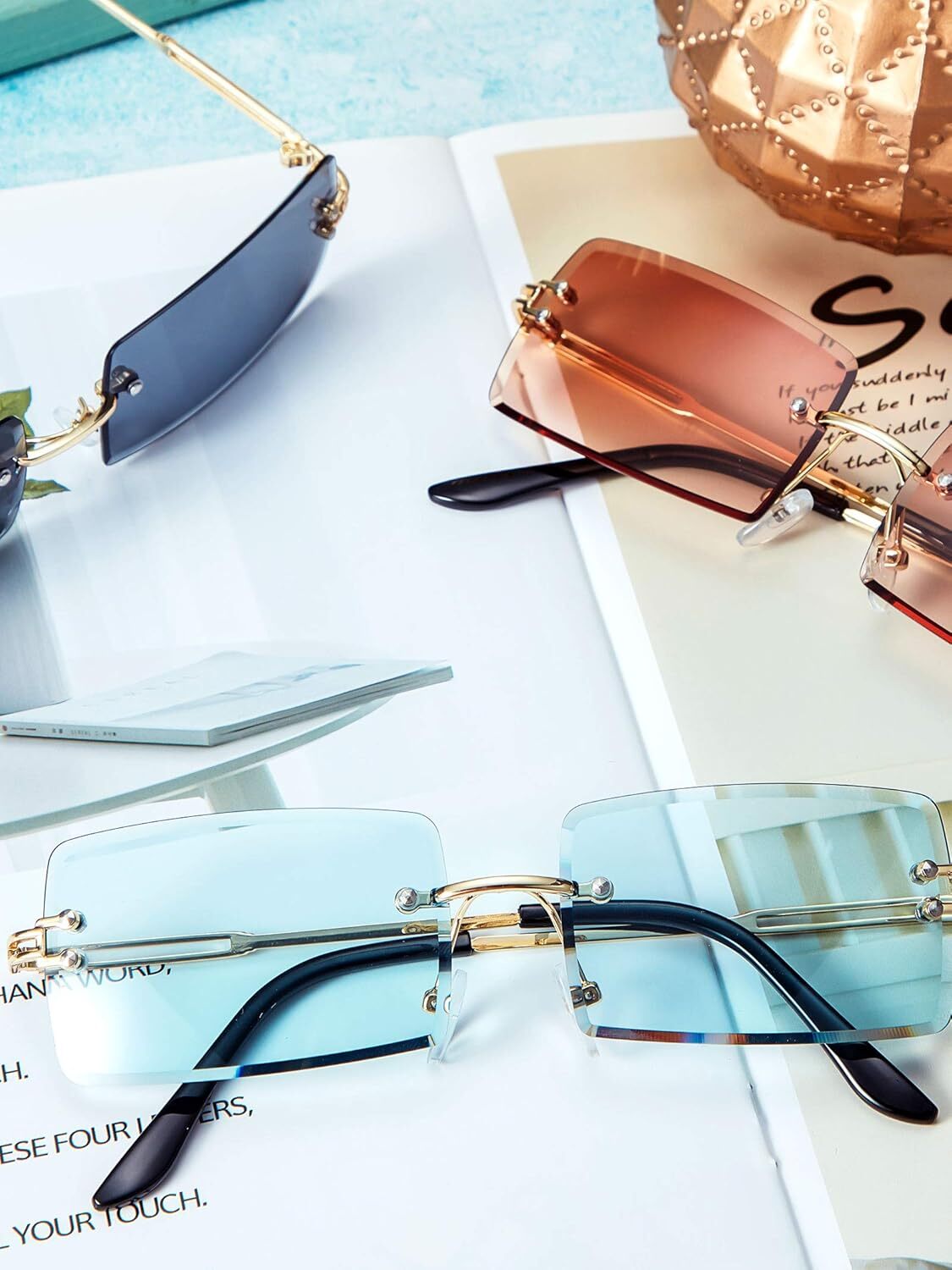 3 Pairs Rimless Rectangle Sunglasses Vintage Transparent Frameless Eyewear